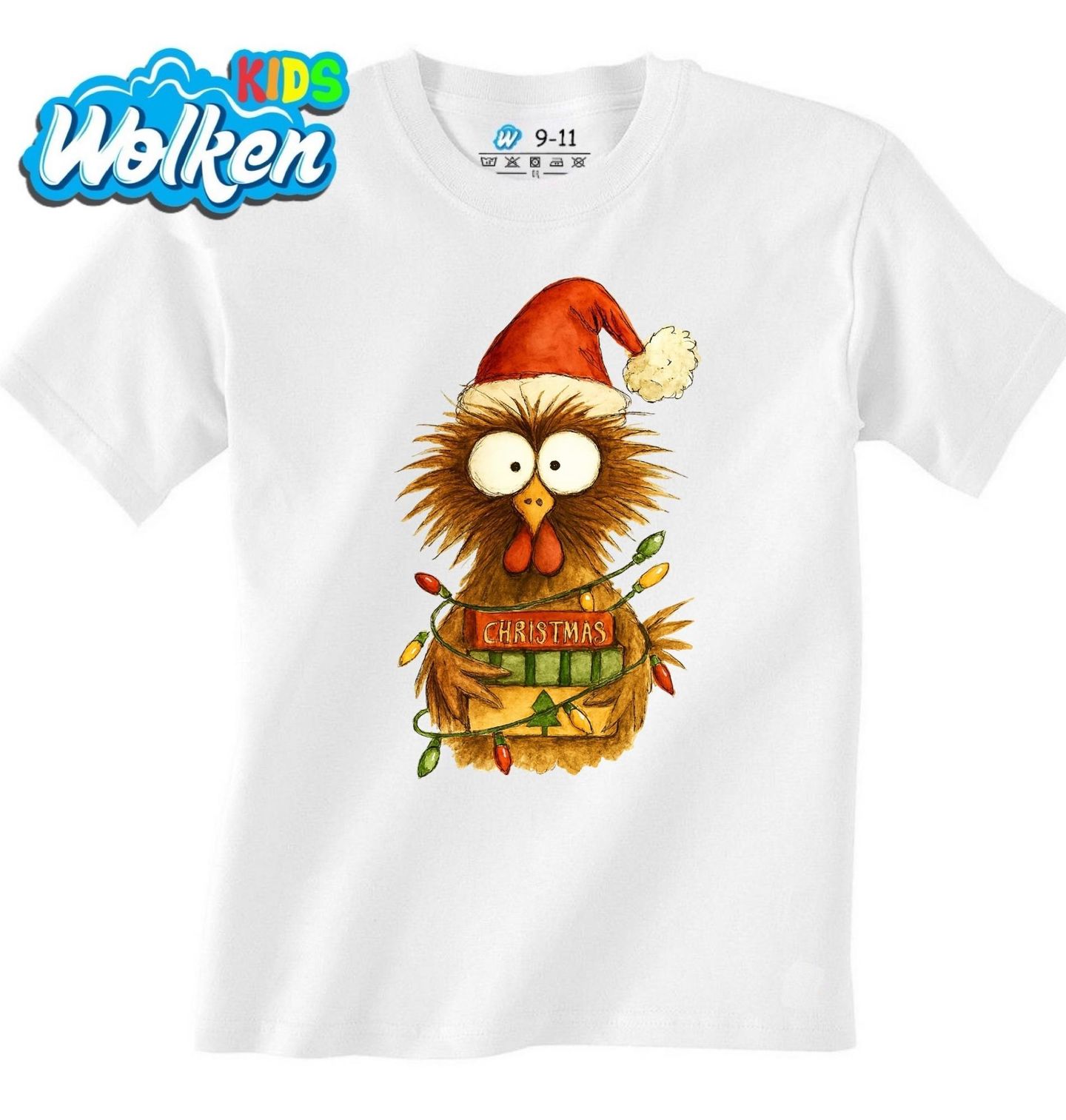 Dětské tričko Vyděšená Vánoční Slepice. Originální motiv pro milovníky zvířat, humoru a sváteční atmosféry! Tato lehce zmatená, ale roztomilá slepice s vánoční čepicí, dárkem a zamotanými světýlky je trefou do černého pro každého, kdo miluje Vánoce s nadsázkou.
