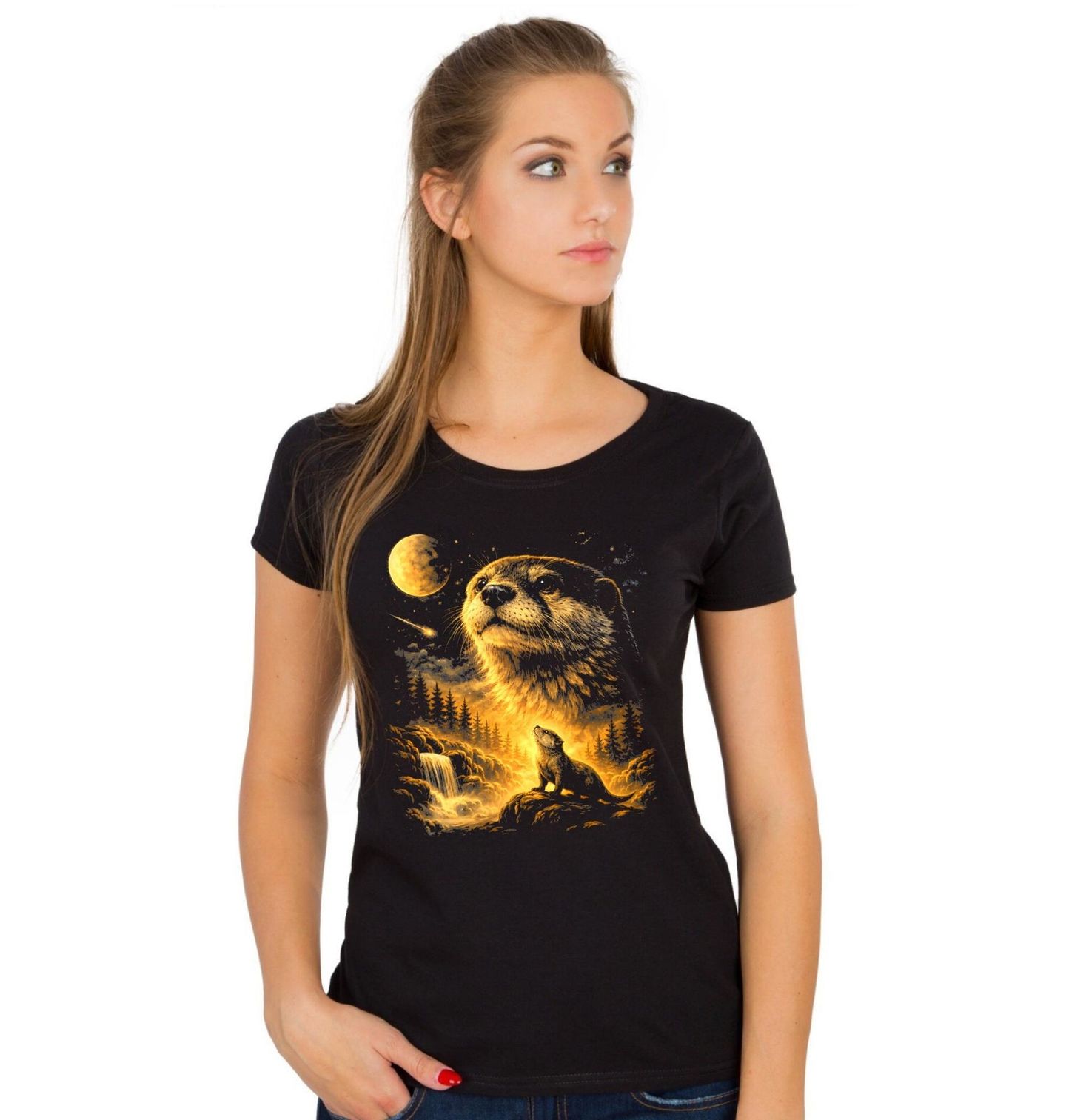 Dámské tričko Vydra a Kouzlo Úplňku. Tento magický design ukazuje vydru v dramatické noční scéně s lesem, vodopádem a zářícím úplňkem na obloze. Teplé světlo měsíce dodává motivu tajemnou atmosféru a zvýrazňuje zvědavý výraz tohoto hravého vodního tvora.