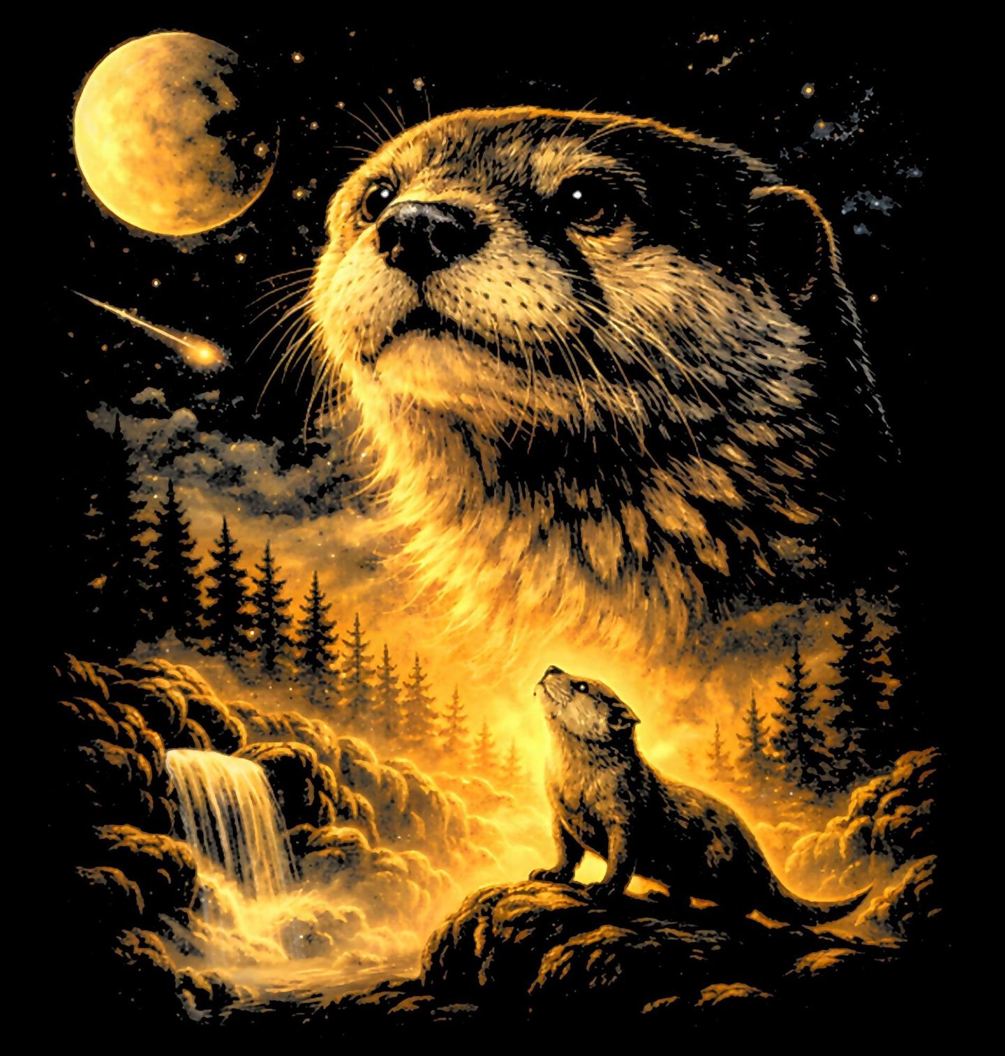 Dětské tričko Vydra a Kouzlo Úplňku. Tento magický design ukazuje vydru v dramatické noční scéně s lesem, vodopádem a zářícím úplňkem na obloze. Teplé světlo měsíce dodává motivu tajemnou atmosféru a zvýrazňuje zvědavý výraz tohoto hravého vodního tvora.
