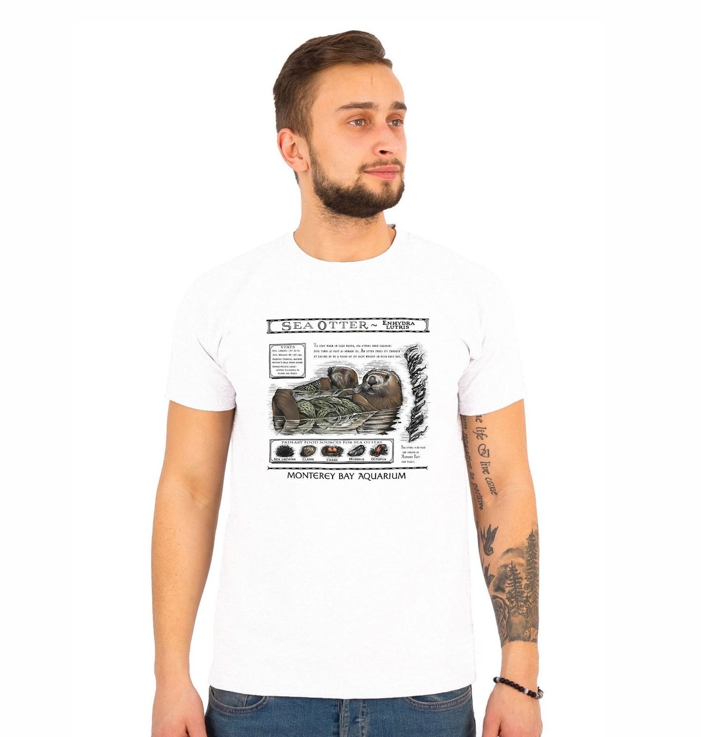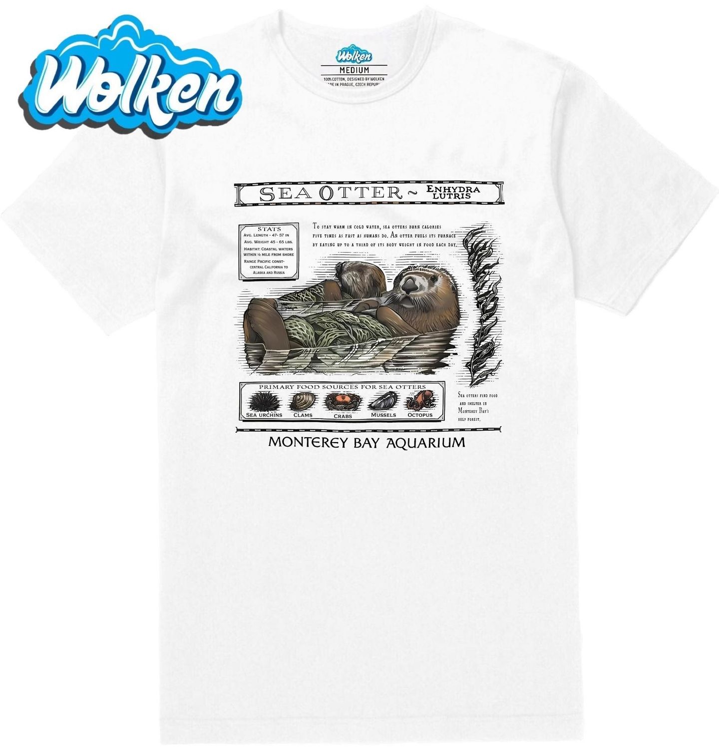 Pánské tričko Vydra mořská Monterey Bay Aquarium. Tento krásně ilustrovaný motiv představuje fascinující životní styl, kterým se vyznačuje vydra mořská (Enhydra lutris). Ideální pro milovníky přírody, oceánu i vzdělávacích ilustrací. Aby si vydra udržela teplo ve studené vodě, spaluje kalorie až pětkrát rychleji než člověk. Energii získává tím, že denně zkonzumuje až třetinu své tělesné hmotnosti.