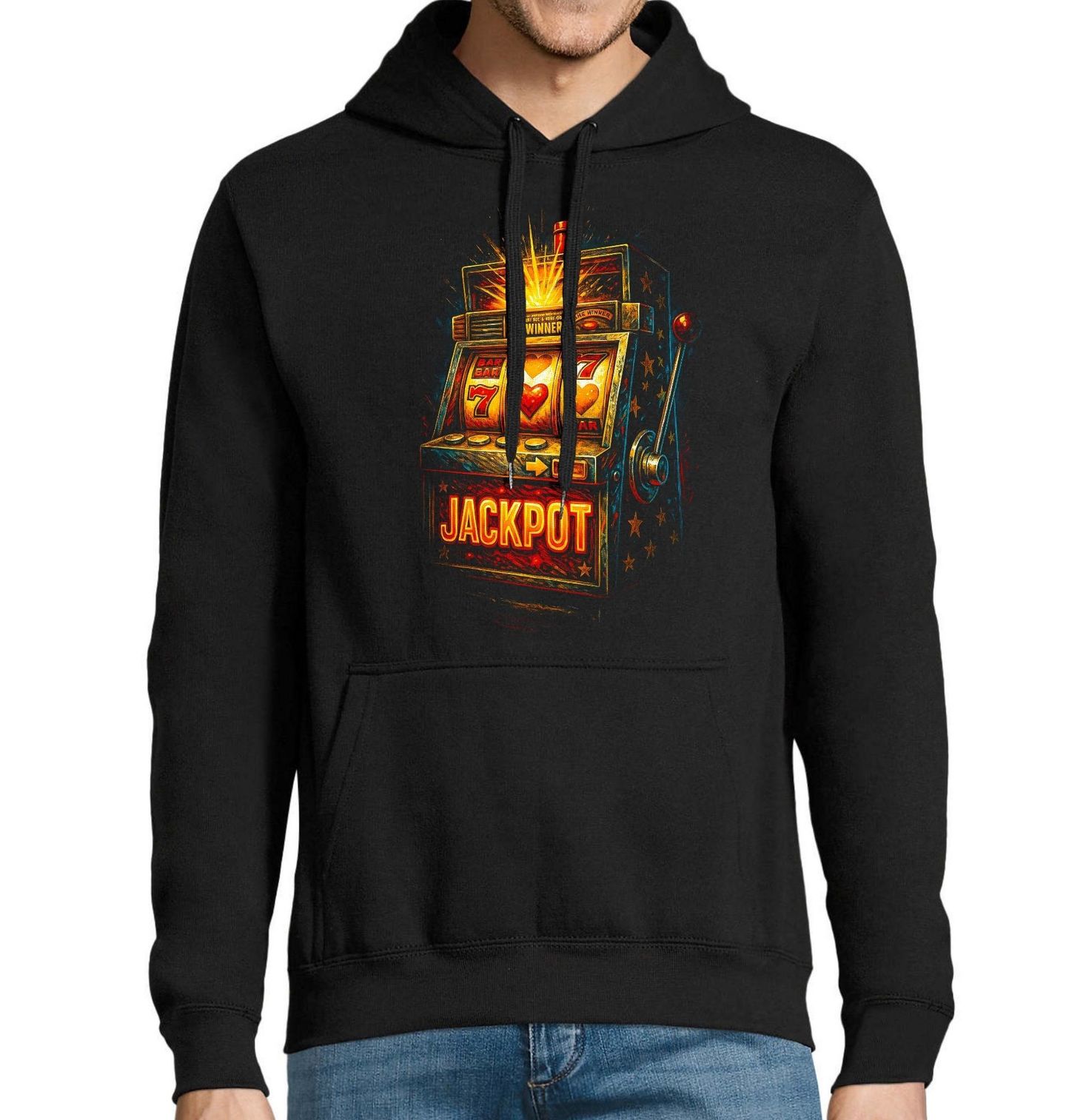 Pánská mikina Výherní Automat Jackpot One Winner. Napětí, štěstí a okamžik, který rozhoduje – tento výrazný motiv zobrazuje herní automat jako symbol risku, adrenalinu a touhy po výhře. Roztočené válce, zářící světla a nápis jackpot zachycují ten jediný moment, kdy se může změnit celý příběh. Herní automat zde představuje svět, kde rozhoduje náhoda, odvaha a chuť jít do hry naplno. Gambling není jen o štěstí, ale o emocích, napětí a odvaze vsadit všechno na jednu kartu.