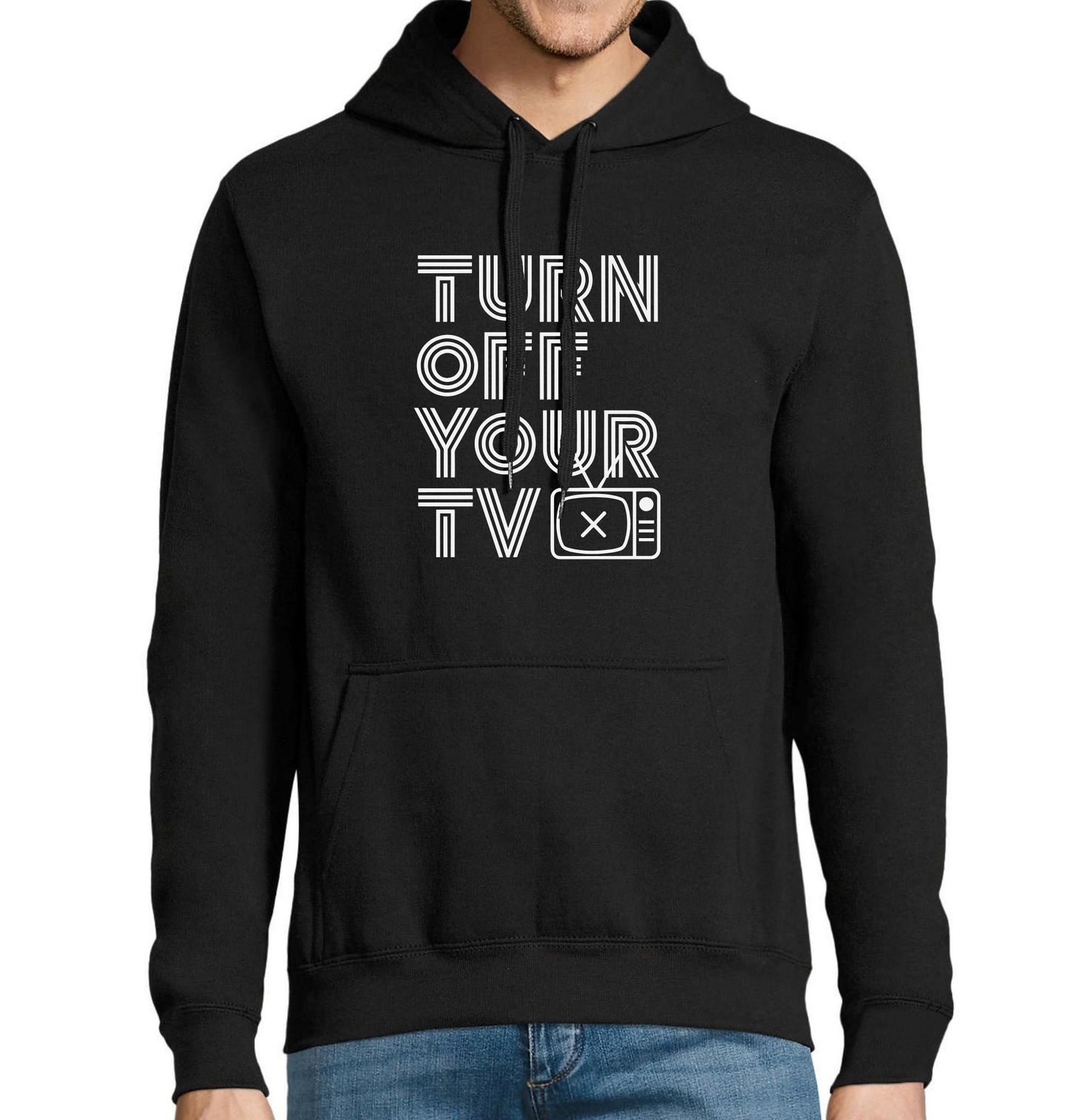 Pánská mikina Vypni televizi Turn off your TV. "Turn off your TV" v ikonickém retro designu. Stylové linie písma a grafika staré televize s vypnutou obrazovkou odkazují na dobu analogového vysílání a zároveň nesou nadčasové poselství - méně televize, více života! Pro milovníky retro módy, fanoušky vintage techniky nebo všechny, kdo chtějí pobavit a inspirovat své okolí.