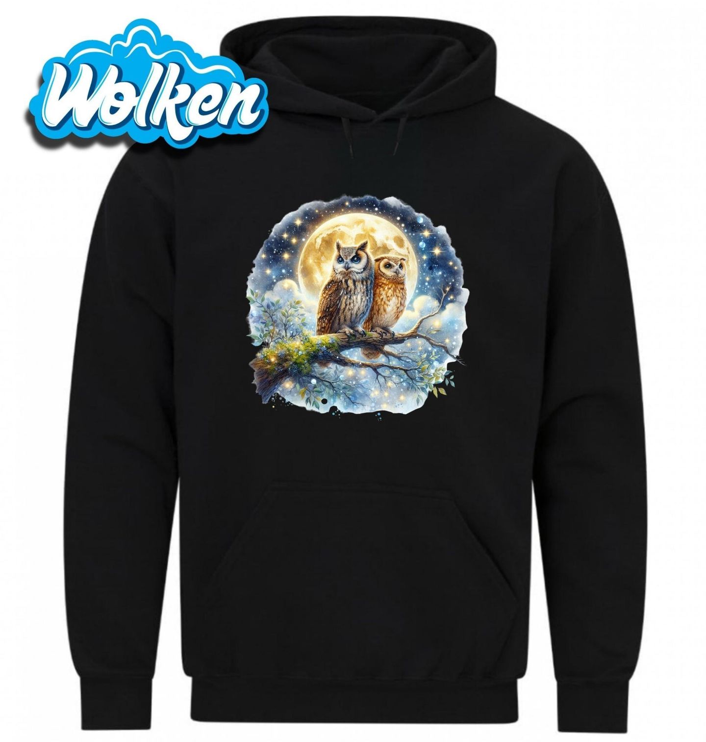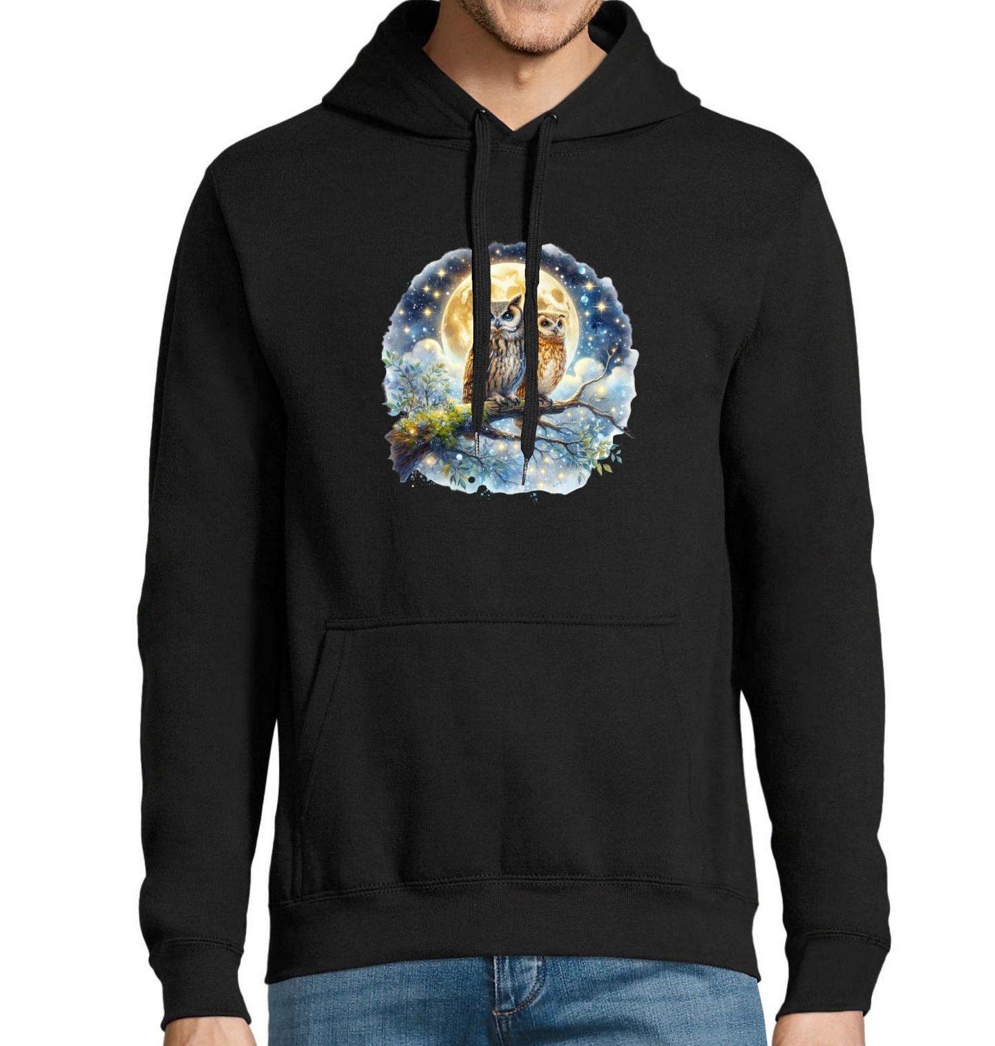 Pánská mikina Výr velký a Puštík obecný Strážci hvězd. Magický motiv dvou sov – výra velkého a puštíka obecného – sedících na větvi pod noční oblohou plnou hvězd a zářícího měsíce. Tento snový obraz spojuje tajemnou krásu lesa, klid měsíčního světla a majestátní pohled sov, které symbolizují moudrost a hloubku noci.