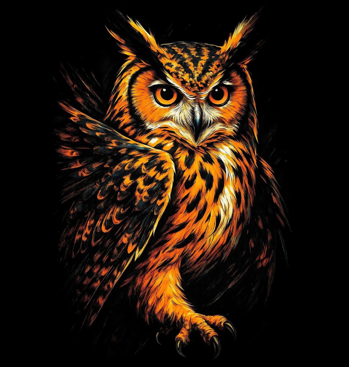 Dámské tričko Výr velký Bubo bubo. Tento působivý motiv zachycuje ptáka Bubo bubo, největší sovu Evropy a skutečného vládce noci. Charakteristické „uši“, pronikavé oranžové oči a mohutné drápy dodávají výru nezaměnitelný, až mytický vzhled. V tomto uměleckém pojetí sova působí dravě, ostražitě a nekompromisně.