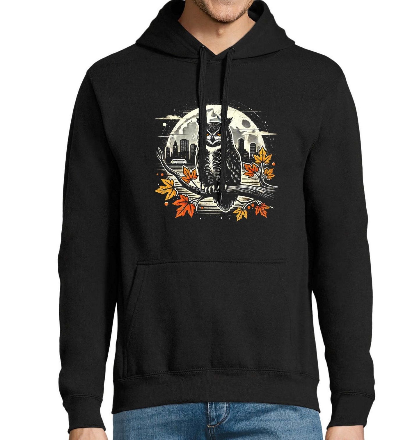 Pánská mikina Výr velký Strážce města. Motiv zachycuje majestátní sovu sedící na podzimem ozdobené větvi, s nočním městem a měsícem v pozadí. Design spojuje syrovou sílu přírody se siluetou městské civilizace a dodává tvému outfitu podzimní atmosféru a záhadnou energii noci. Pro milovníky zvířat, měst i krásy podzimu.