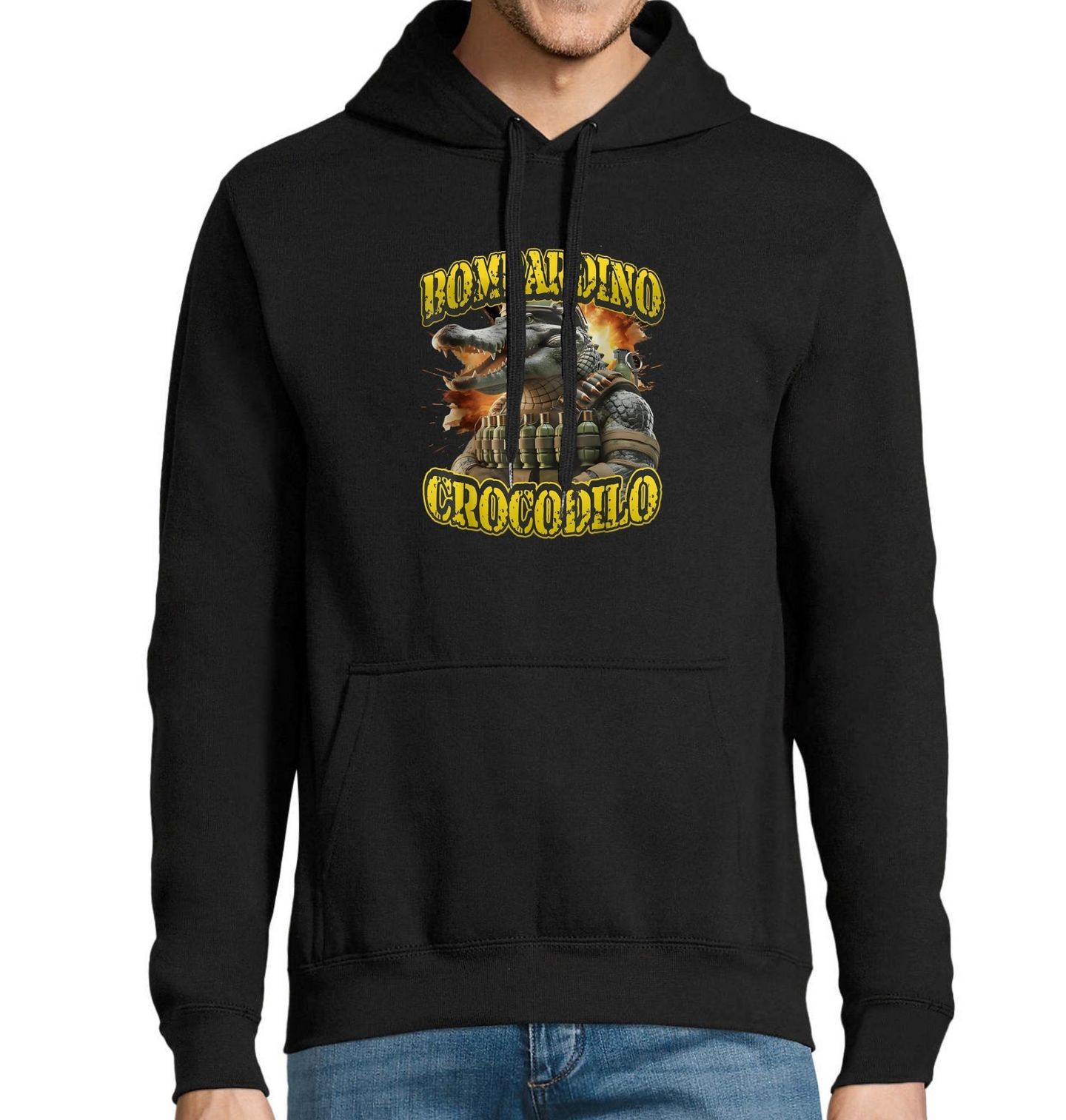 Pánská mikina Výsadkář z Bažin Bombardino Crocodilo. Krokodýlí komandér, který místo v řece skáče z letadla s granátovým pásem a jde na stylový útok. Italský brairot ve své nejvýbušnější podobě. Pokud tvůj šatník postrádá kousek plný šílenství, drsnosti a meme humoru, právě jsi ho našel.
