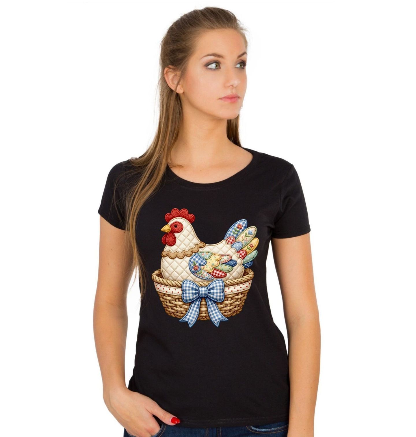 Dámské tričko Vyšívaná Slepice Folk. Slepice je symbolem venkova, pohody a tradice, zatímco folk styl přináší hravost a barevnou harmonii. Celý motiv působí jako vyšívaný obrázek, který v sobě spojuje lidovou estetiku s moderním zpracováním. Detailní struktura a jemné vzory vytvářejí dojem látky a výšivky, což dodává designu hřejivý a domácí charakter inspirovaný prostředím, jaké nabízí farma.