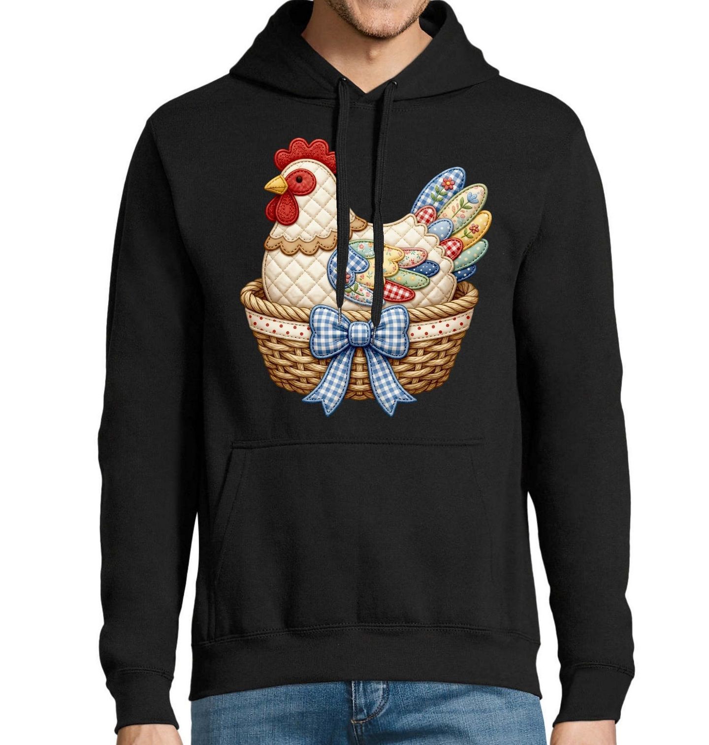 Pánská mikina Vyšívaná Slepice Folk. Slepice je symbolem venkova, pohody a tradice, zatímco folk styl přináší hravost a barevnou harmonii. Celý motiv působí jako vyšívaný obrázek, který v sobě spojuje lidovou estetiku s moderním zpracováním. Detailní struktura a jemné vzory vytvářejí dojem látky a výšivky, což dodává designu hřejivý a domácí charakter inspirovaný prostředím, jaké nabízí farma.