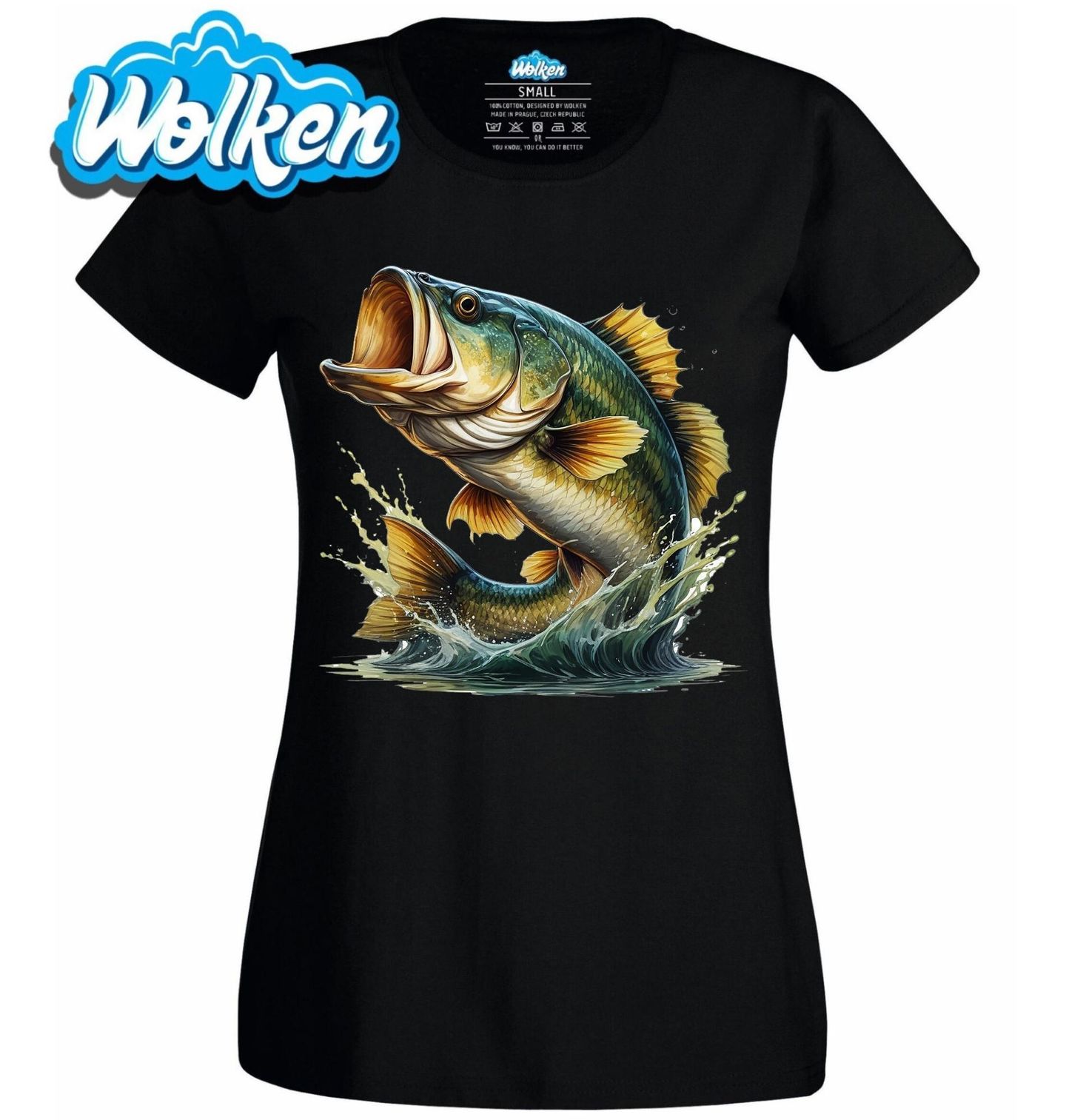 Dámské tričko Výskakující Okoun z Vody. Tento motiv zachycuje okounovce velkoústého v plné síle při výskoku z vody – ikonickou rybu, která je snem každého vášnivého rybáře. Je ideální pro fanoušky přívlače a sportovního rybaření, kteří oceňují dynamiku, detail a respekt k tomuto dravci.