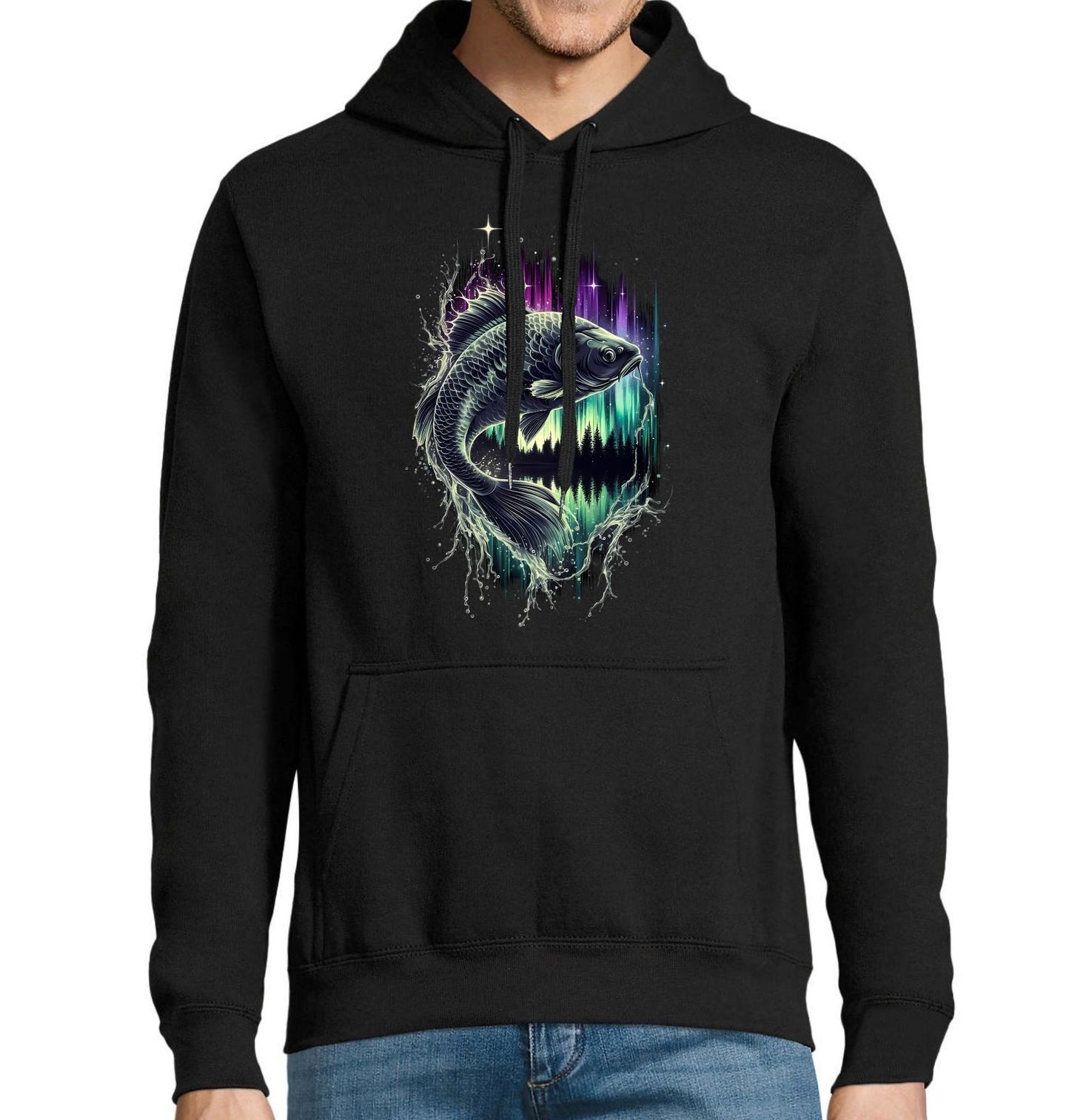 Pánská mikina Výskok Kapra při Polární Záři. Magický motiv zachycuje kapra v okamžiku výskoku nad hladinu, obklopeného noční krajinou a září připomínající polární světla. Tento design spojuje vášeň pro rybaření s tajemnou atmosférou přírody a sílou vody. Detailní zpracování šupin, dynamika pohybu i odraz lesa na hladině vytváří silný vizuální zážitek.