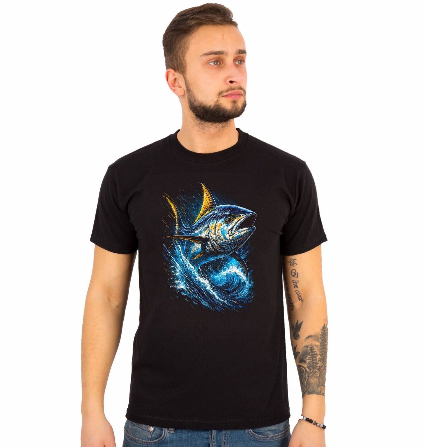 Pánské tričko Výskok Tuňáka žlutoploutvého. Dynamický motiv zachycuje tuňáka, jednu z nejsilnějších a nejrychlejších mořských ryb, ve chvíli, kdy proráží vlny otevřeného oceánu. Tuňák je ikonickou rybou sportovního lovu a snem nejednoho rybáře. Tento design je ideální pro každého, kdo miluje rybaření, moře a adrenalin spojený s lovem velkých mořských ryb.