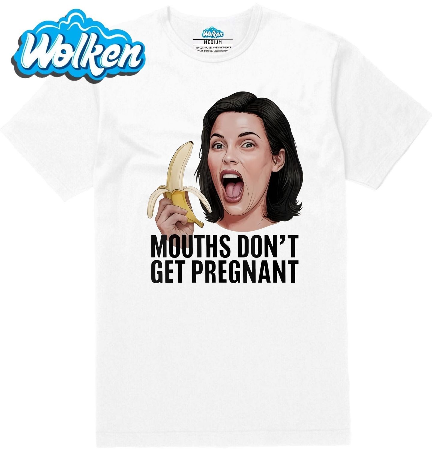 Pánské tričko Z pusy neotěhotníš. „Mouths don’t get pregnant“ - „Z pusy se neotěhotní.“ v kombinaci s realistickou ilustrací ženy s banánem přináší odvážný humor a nadsázku na téma sex a bezpečnost. Ideální dárek pro lidi se smyslem pro sarkasmus a banánovou odvahu.
