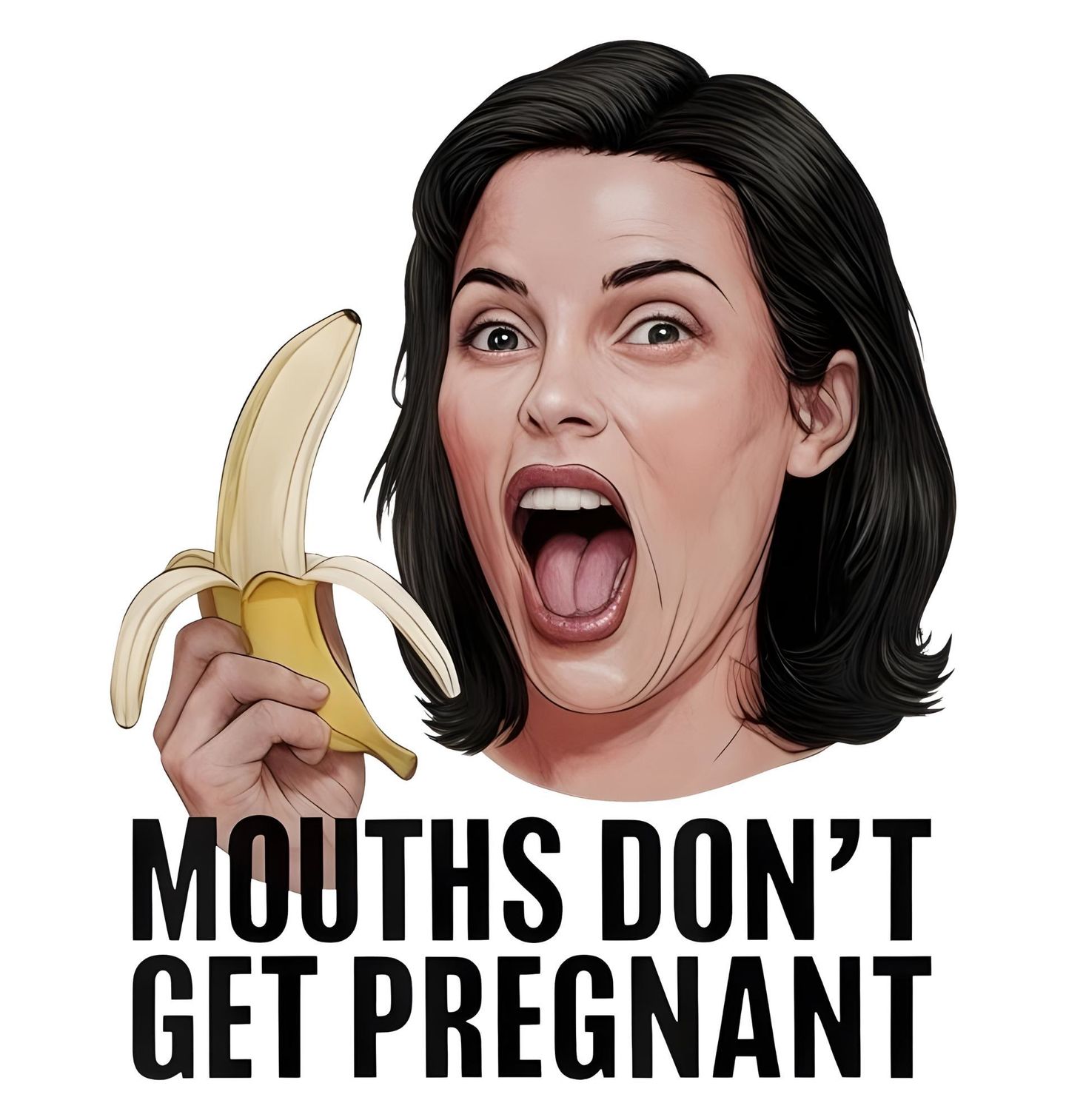 Dámské tričko Z pusy neotěhotníš. „Mouths don’t get pregnant“ - „Z pusy se neotěhotní.“ v kombinaci s realistickou ilustrací ženy s banánem přináší odvážný humor a nadsázku na téma sex a bezpečnost. Ideální dárek pro lidi se smyslem pro sarkasmus a banánovou odvahu.