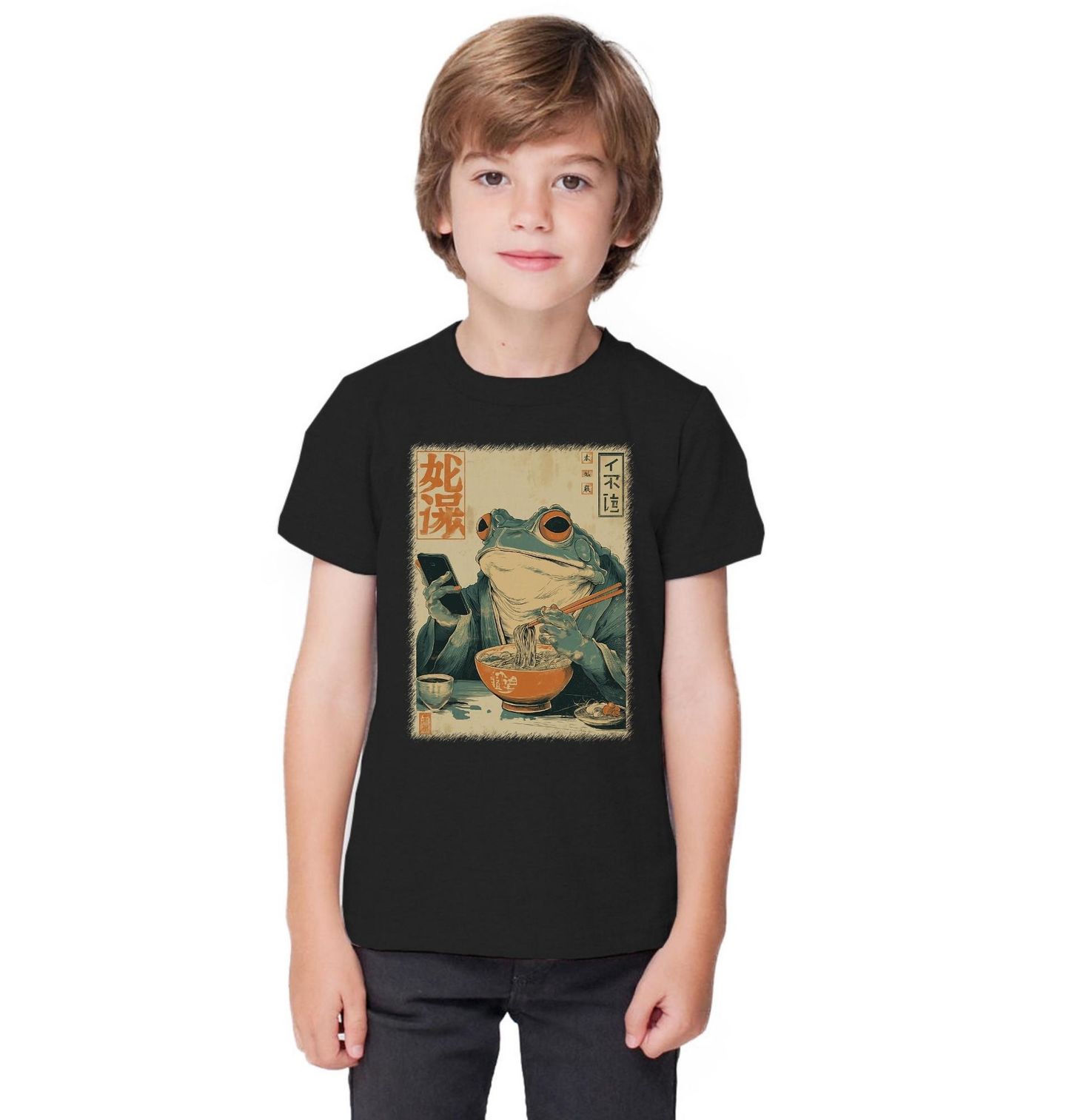 Dětské tričko Žába a Miska Ramen Nudlí. Uprostřed ilustrace sedí stylová žába, oblečená v japonském oděvu, a vychutnává si misku lahodného ramenu, zatímco drží mobilní telefon. Kombinace vintage japonské grafiky a současného humoru vytváří jedinečný design pro každého kdo miluje Japonsko.