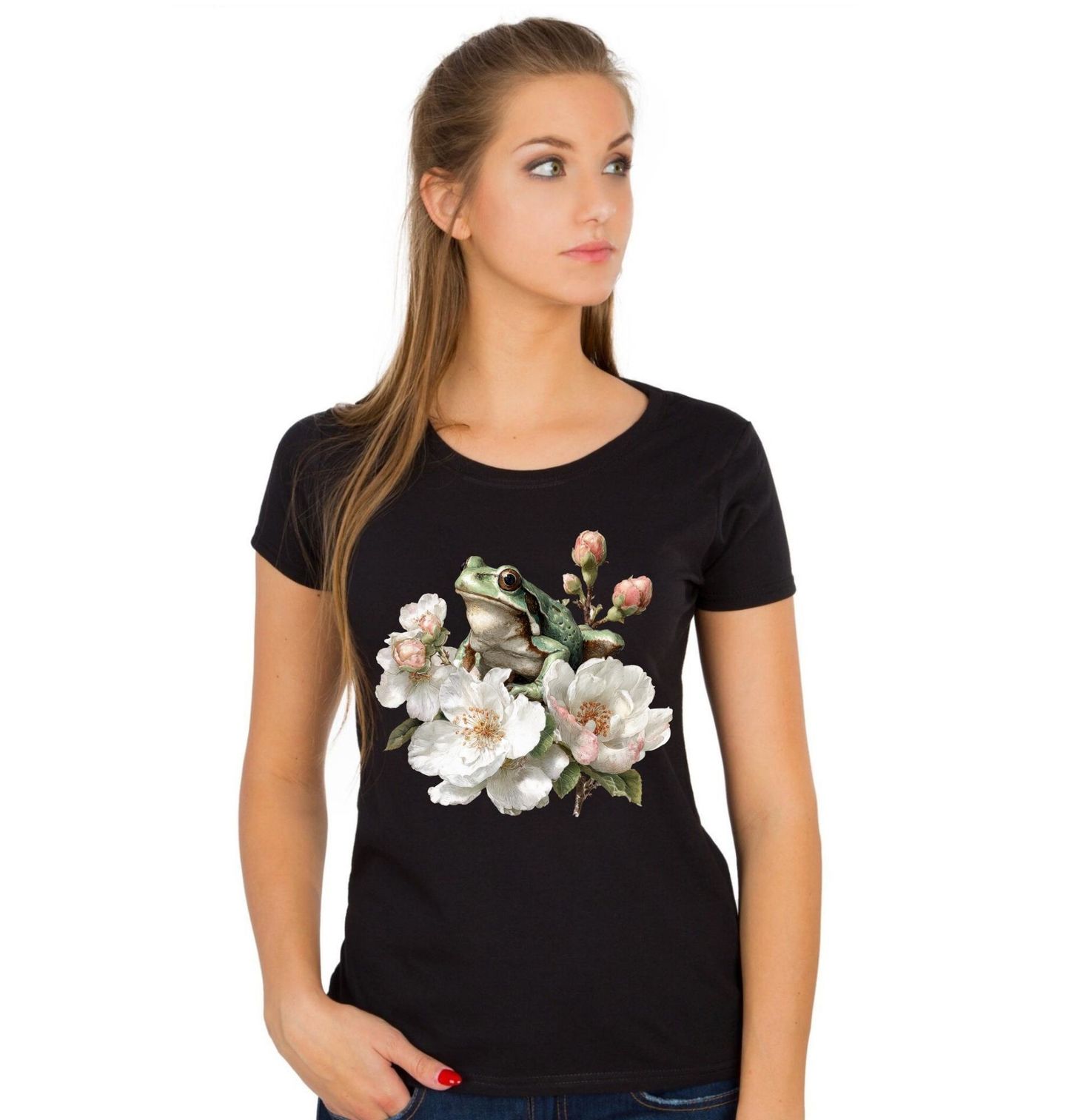 Dámské tričko Žába mezi Květy Jabloně. Originální motiv, kde hlavní roli hraje něžná žába usazená mezi rozkvetlými květy jabloně. Ilustrace působí jemně a romanticky, kombinuje přírodní krásu jarní zahrady s roztomilým zvířecím motivem. Detailní zpracování květů připomíná skutečný květ jabloně – bílé okvětní lístky s lehce narůžovělými poupátky dodávají designu svěží a elegantní vzhled.