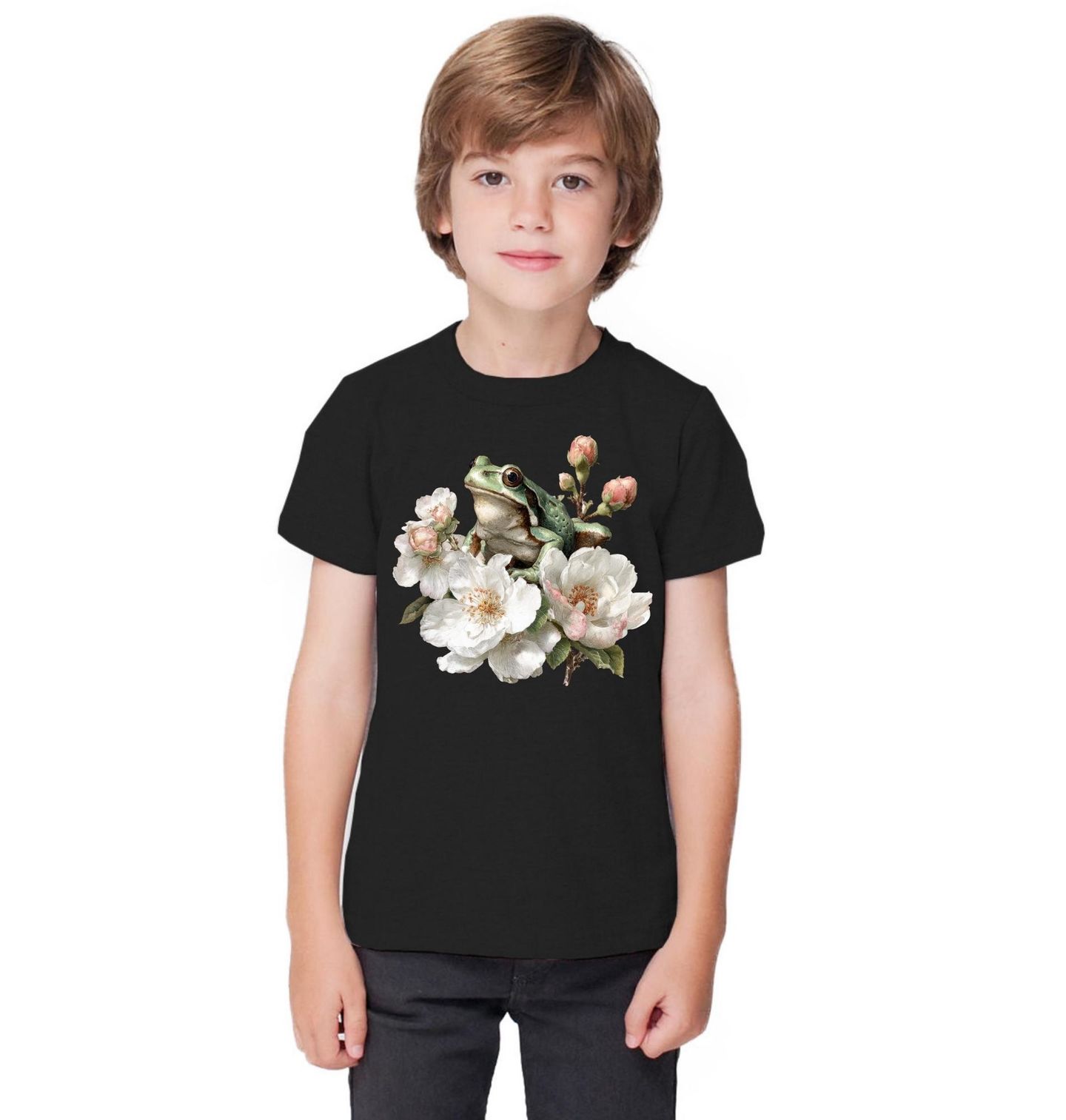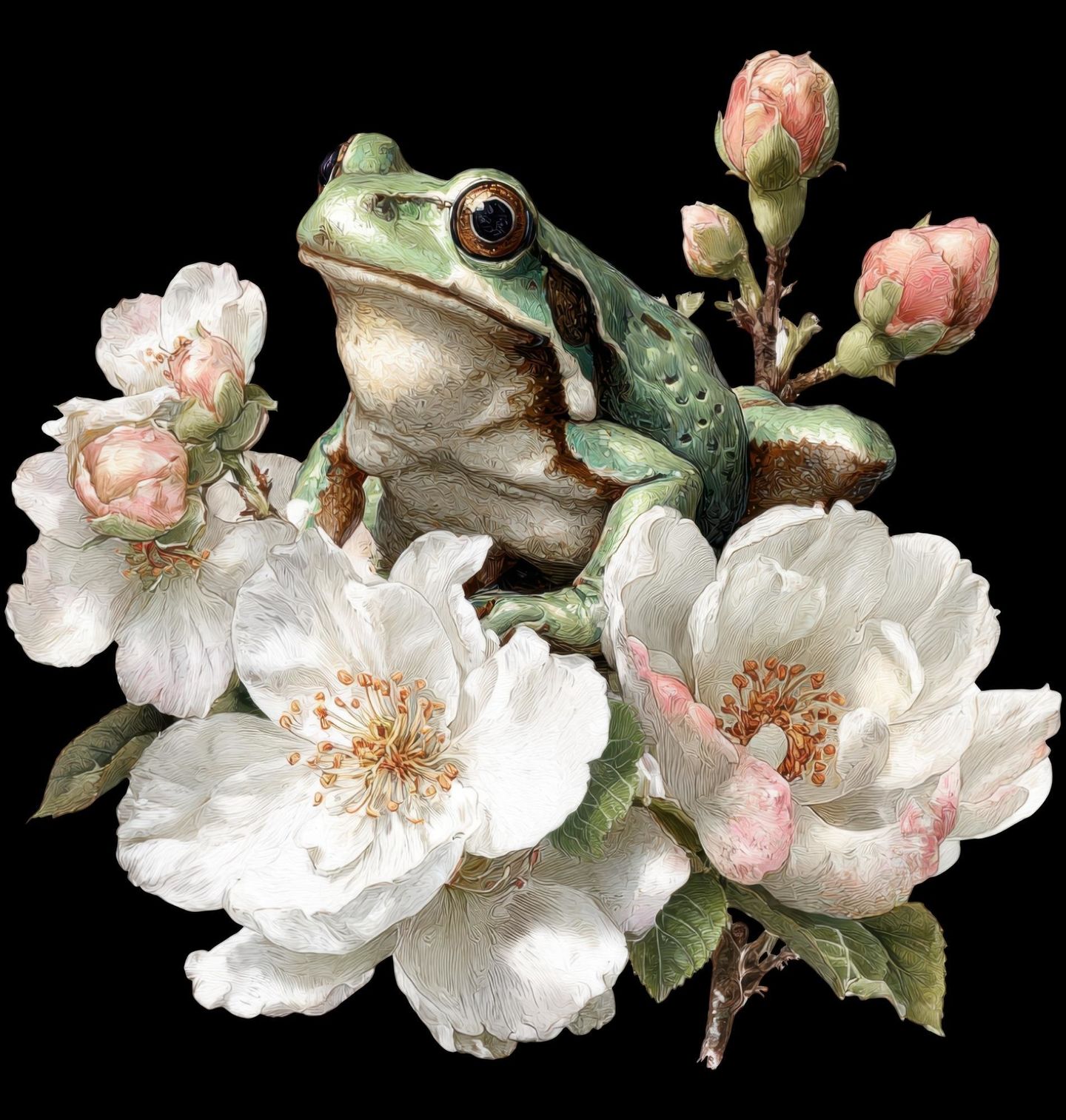 Dětské tričko Žába mezi Květy Jabloně. Originální motiv, kde hlavní roli hraje něžná žába usazená mezi rozkvetlými květy jabloně. Ilustrace působí jemně a romanticky, kombinuje přírodní krásu jarní zahrady s roztomilým zvířecím motivem. Detailní zpracování květů připomíná skutečný květ jabloně – bílé okvětní lístky s lehce narůžovělými poupátky dodávají designu svěží a elegantní vzhled.