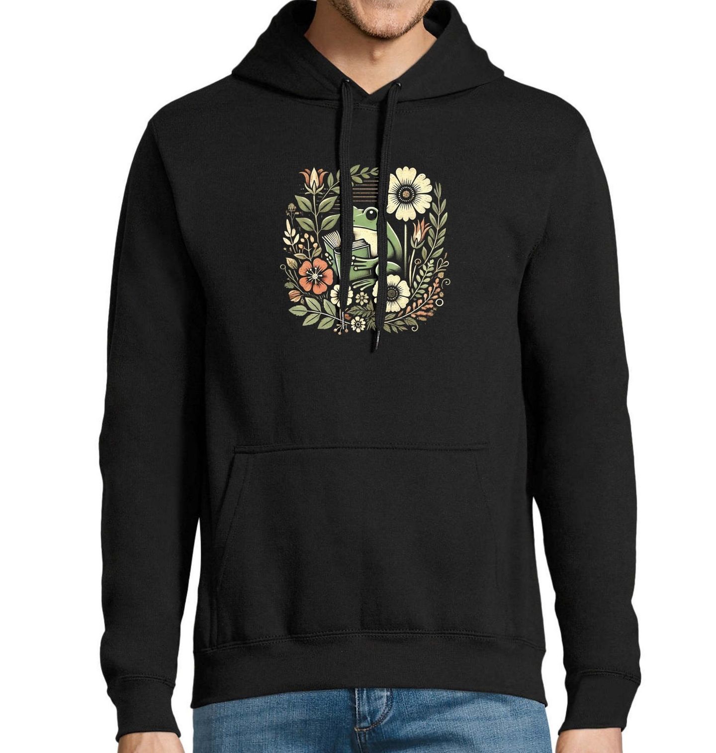 Pánská mikina Žába s Knihou mezi Květinami. Objevte kouzlo klidu a fantazie s tímto originálním tričkem, na kterém se žába ponořila do čtení knihy uprostřed bohatých květin. Ideální pro milovníky přírody, knih a neobvyklých motivů. Tento design propojuje svět zvířat, literatury a rozkvetlých květin v harmonickém obrazu, který zaujme na první pohled.