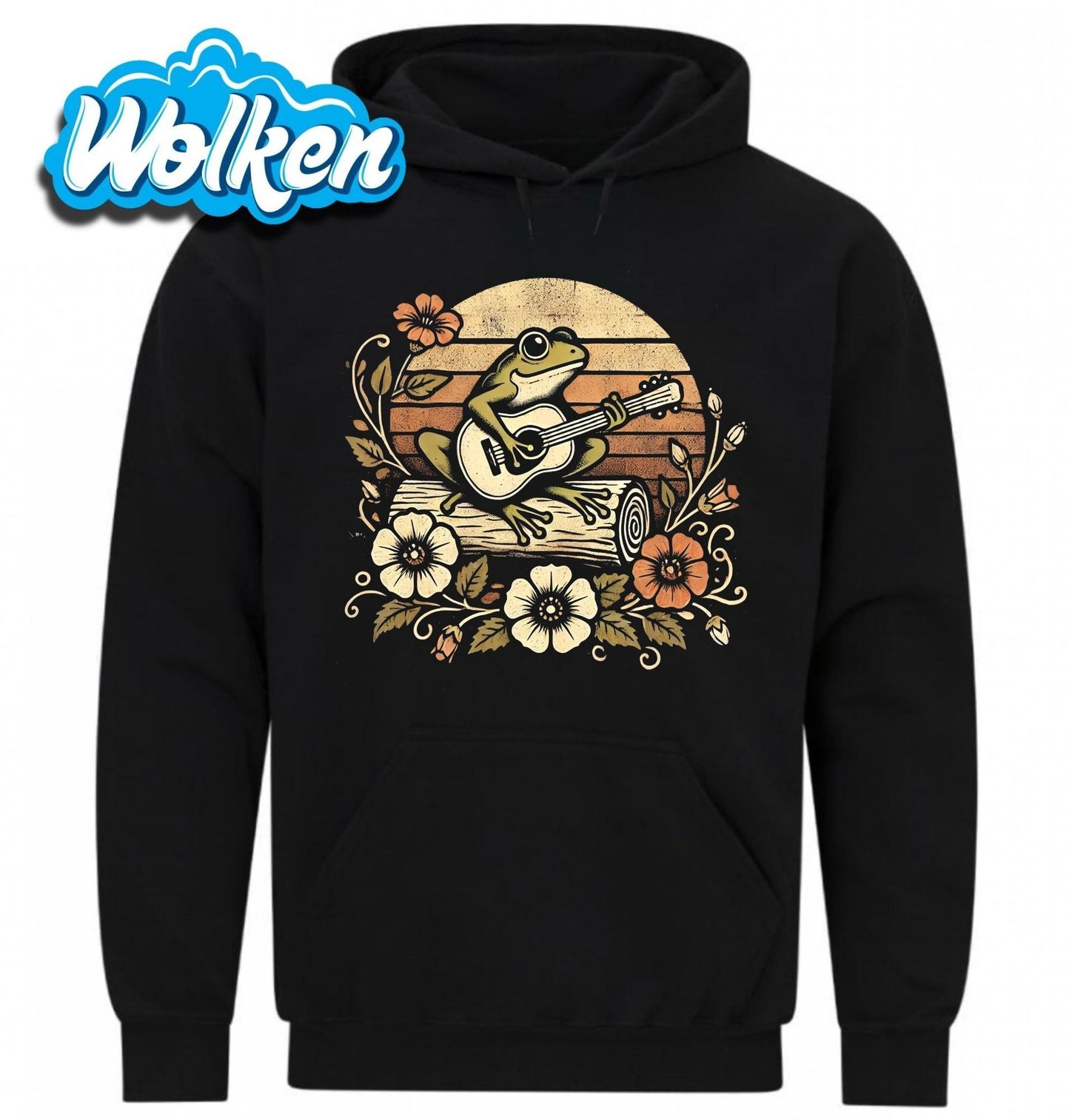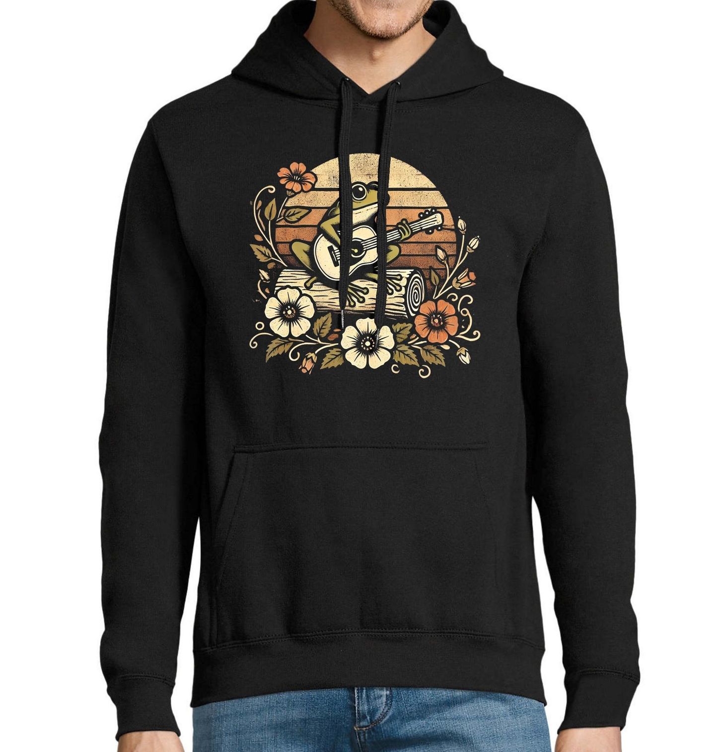 Pánská mikina Žába s kytarou na květinách. Tahle hudební žába přináší kouzlo venkovského folku přímo do bažin! Pohodově sedí na pařezu, brnká na kytaru a zpívá písně přírody. Perfektní design pro milovníky hudby, retro estetiky a zvířecího humoru.