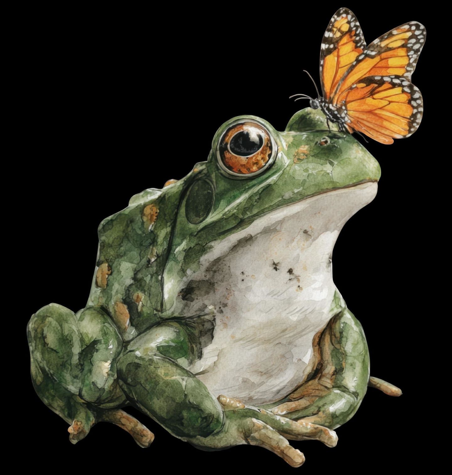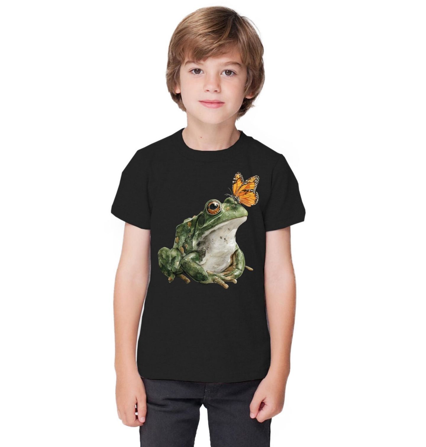 Dětské tričko Žába s Motýlem. Akvarelové zpracování dodává ilustraci jemnost a přírodní atmosféru, díky které působí design harmonicky a pozitivně. Motiv žába a motýl symbolizuje klid, proměnu i propojení s přírodou, takže je ideální pro milovníky zvířat a decentního stylu.