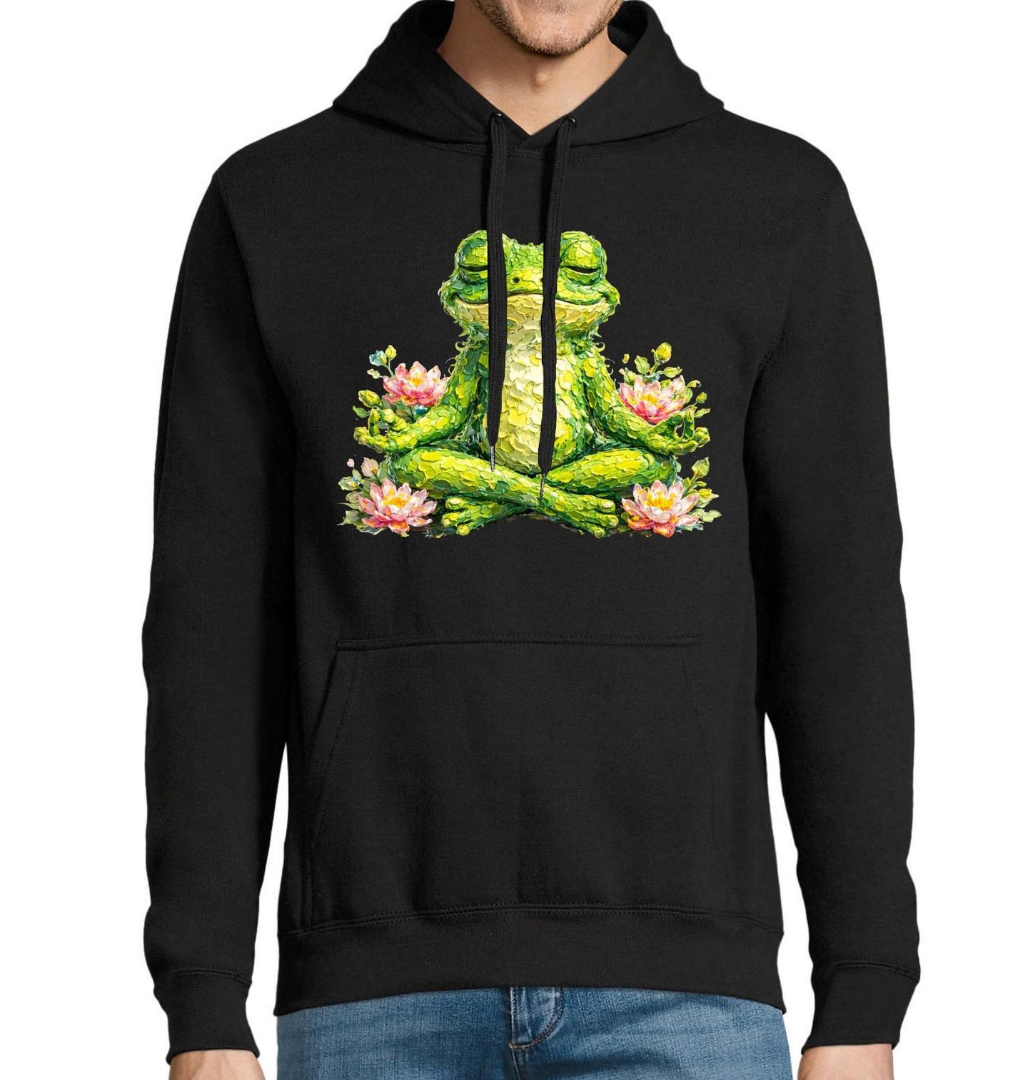 Pánská mikina Žába v Lotosovém Sedu. Harmonie, klid a lehká hravost – tento originální motiv zachycuje žába v pozici meditace obklopenou jemnými květy. Celý design působí jako malovaný štětcem, což mu dodává jedinečný umělecký charakter a příjemnou, uklidňující atmosféru. Detailně zpracovaná žába sedící v hluboké meditace vyzařuje pohodu a rovnováhu.