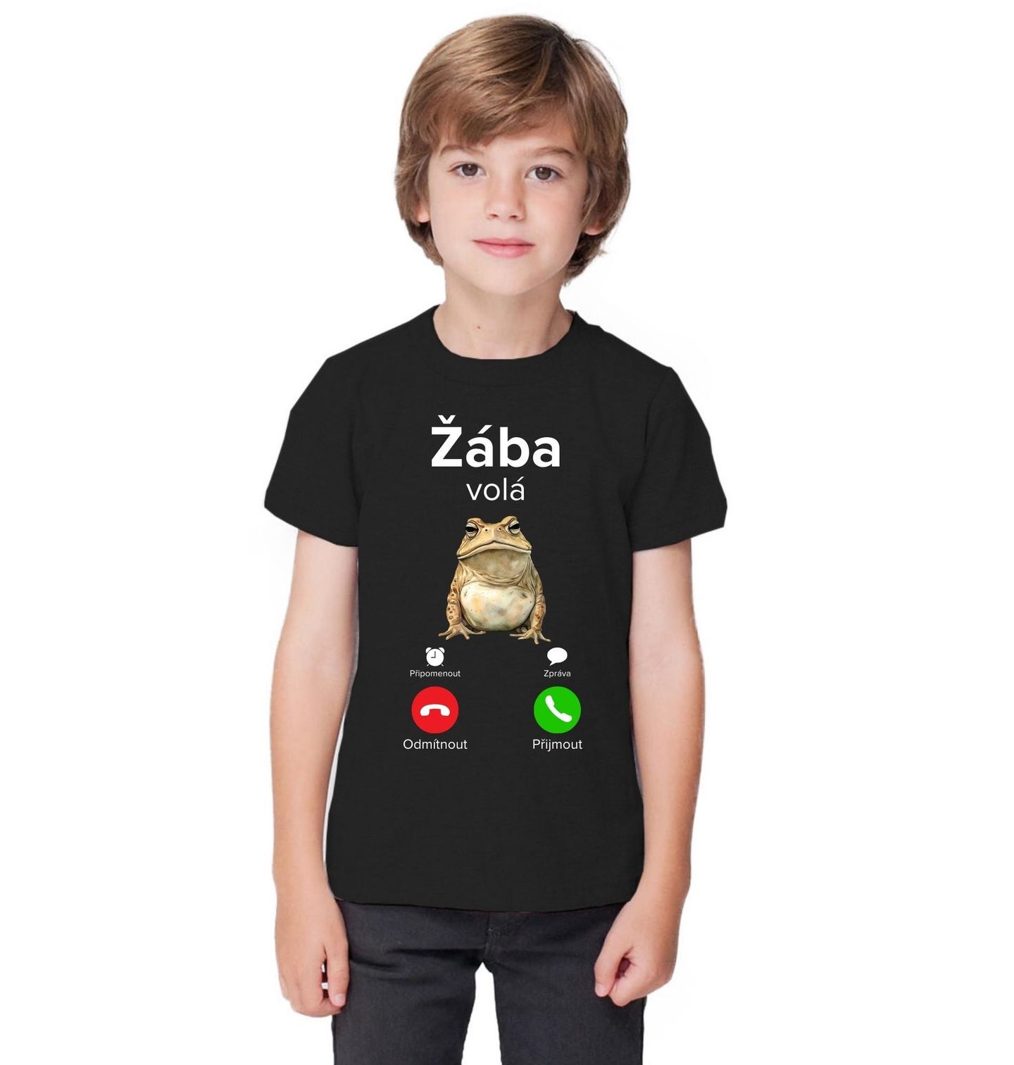 Dětské tričko Žába Volá Phone Call. Tenhle originální a humorný motiv napodobuje příchozí hovor na telefonu – jen místo kontaktu se na displeji objeví žába. Nahoře je napsáno „Žába volá“ a dole nechybí ani známá tlačítka Odmítnout a Přijmout, takže to vypadá, jako by opravdu volala právě tahle žába.