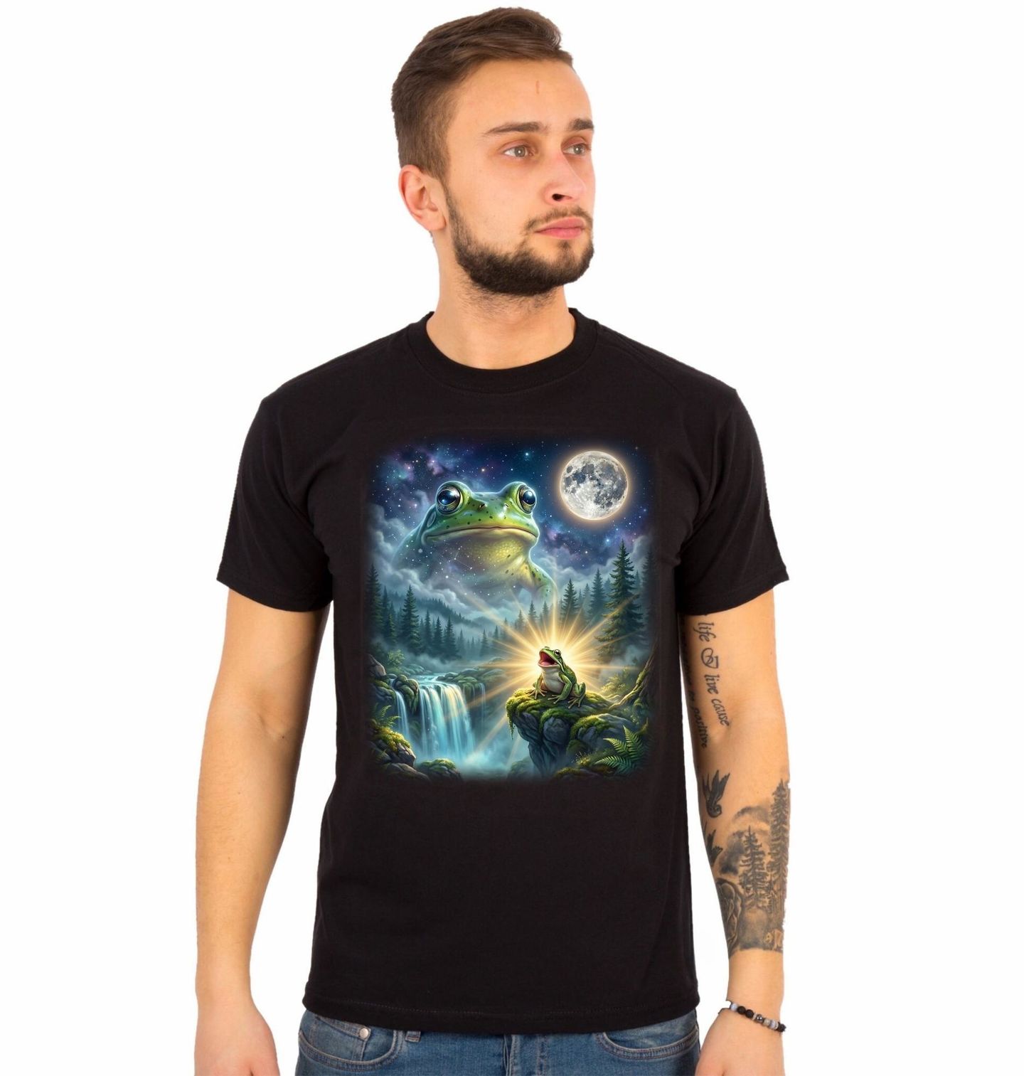 Pánské tričko Žába vyjící na Měsíc. Nechte se unést do světa fantazie s tímto jedinečným motivem, kde hlavní roli hraje magická žába v kouzelné noční krajině. Pod zářícím měsíc stojí na skále malá žába, zatímco nad ní se vznáší její obří mystická podoba, která dodává celé scéně snový a až nadpozemský nádech.