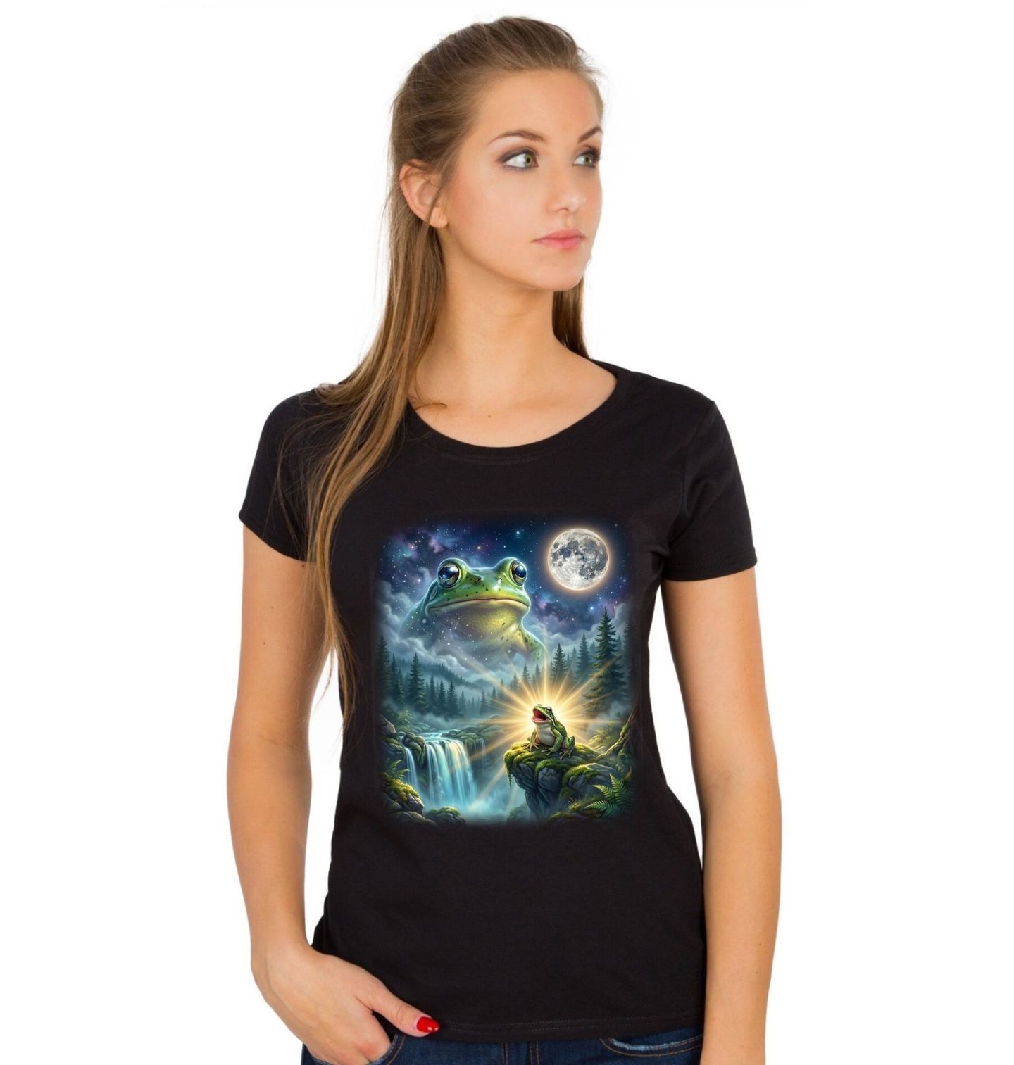 Dámské tričko Žába vyjící na Měsíc. Nechte se unést do světa fantazie s tímto jedinečným motivem, kde hlavní roli hraje magická žába v kouzelné noční krajině. Pod zářícím měsíc stojí na skále malá žába, zatímco nad ní se vznáší její obří mystická podoba, která dodává celé scéně snový a až nadpozemský nádech.