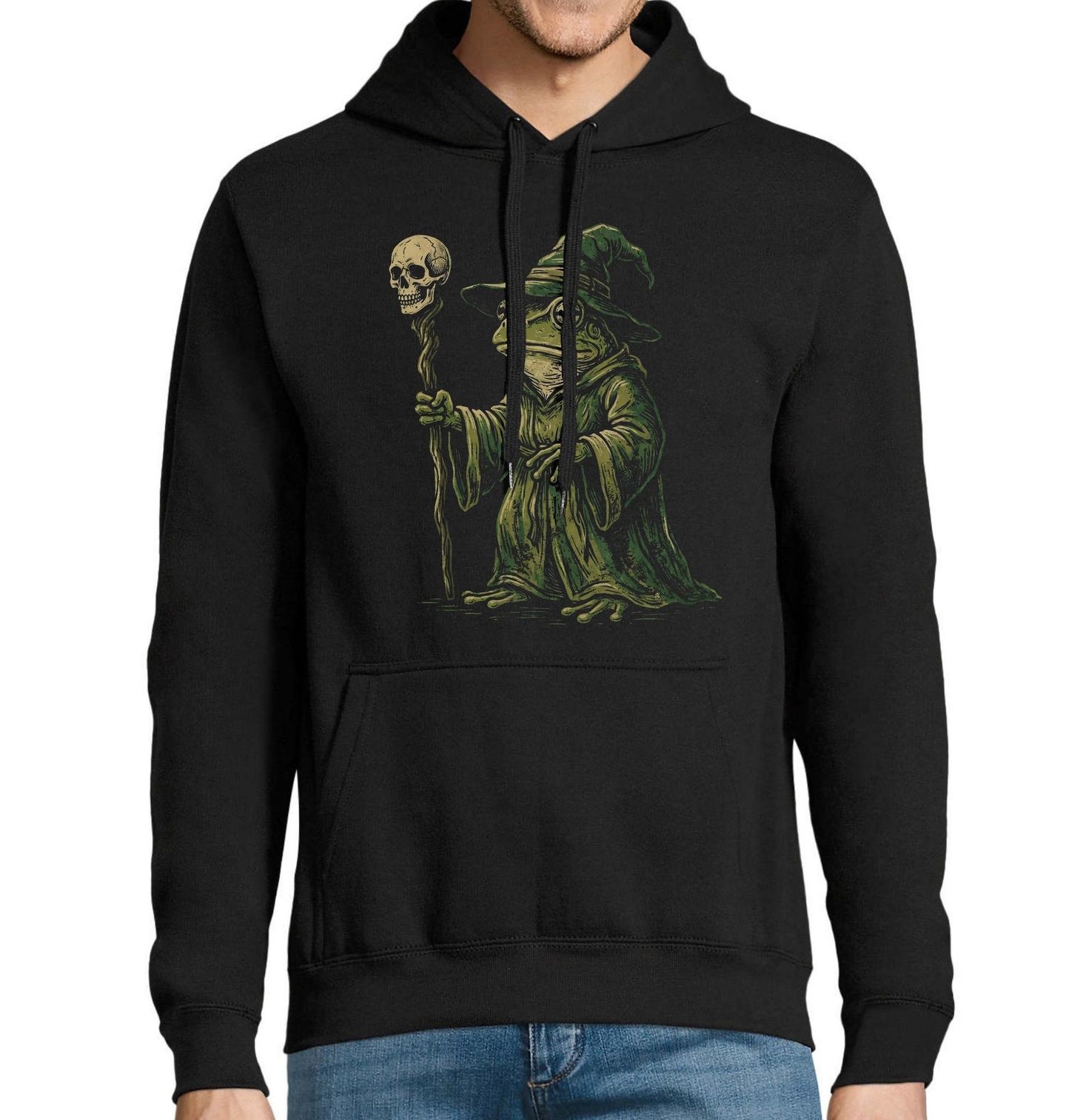 Pánská mikina Žábí Čarodějka. Tento originální motiv přináší temnou fantasy atmosféru, kde hlavní roli hraje tajemná žába v podobě čaroděje. Oblečená v magickém plášti a klobouku drží hůl, na jejímž vrcholu se nachází děsivá lebka – symbol magie, síly a tajemství.