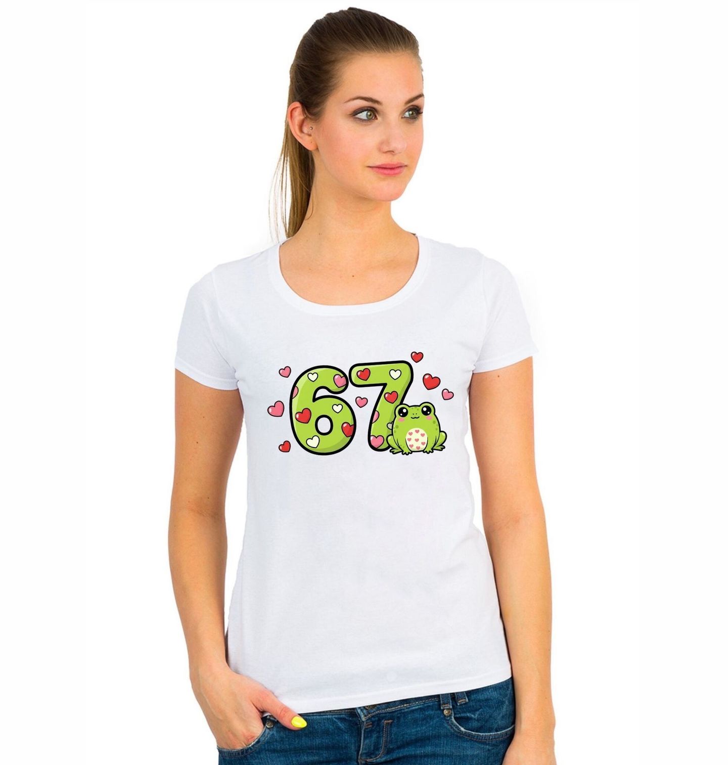 Dámské tričko Žabí Meme 67 Six Seven. Rozkošný a hravý motiv 67, který potěší každého milovníka žabek! Číslo 67 je v zelené barvě a je poseté srdíčky – hned vedle sedí usměvavá žába s roztomilým výrazem. Ideální pro ty, kdo milují veselý styl, pozitivní energii a vtipné meme motivy.