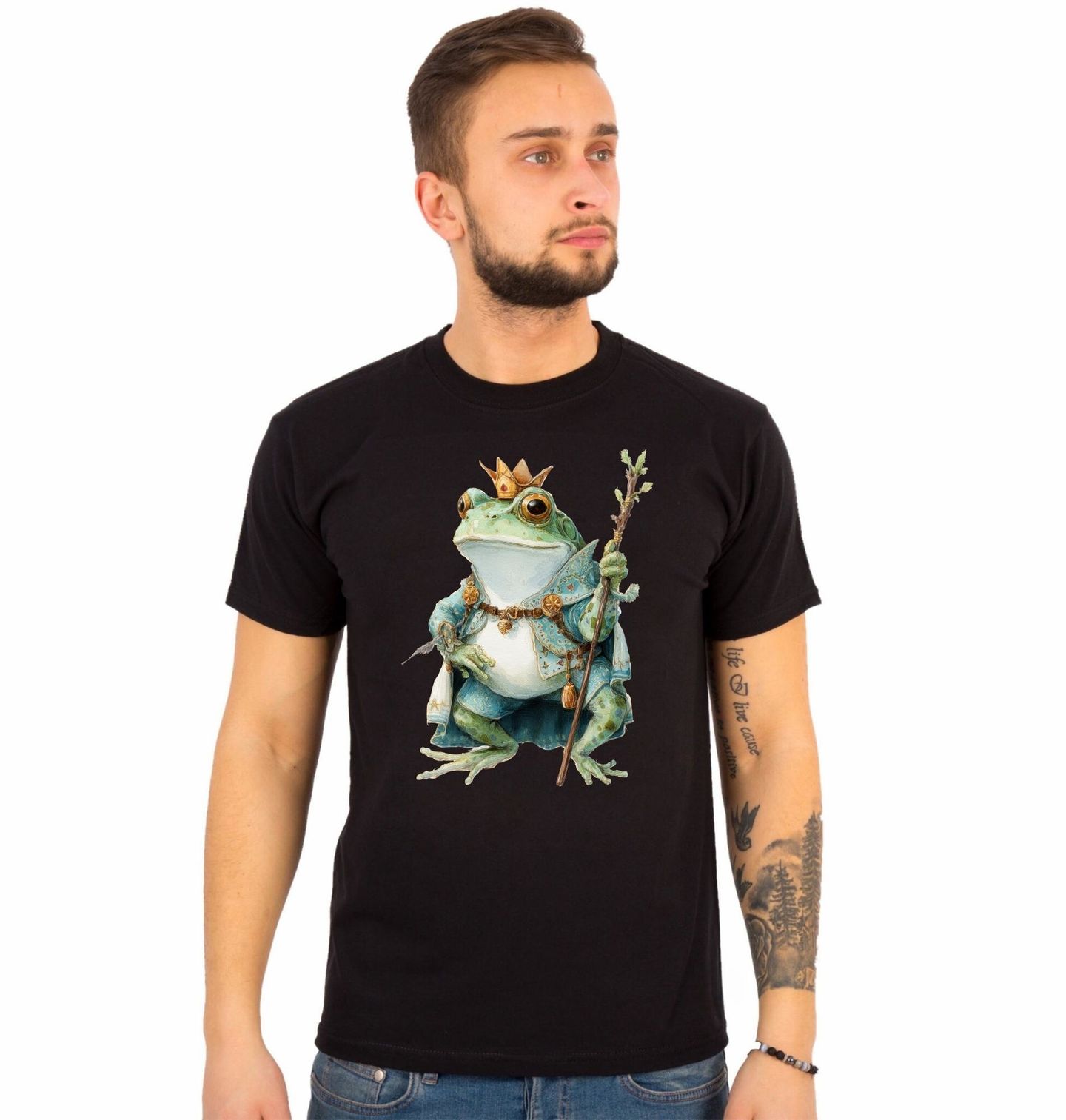 Pánské tričko Žábí Princ. Originální ilustrace zobrazuje stylovou pohádkovou postavu, kterou je elegantní žába v královském plášti s korunou a kouzelnickou holí. Jemný akvarelový styl dodává motivu fantazijní atmosféru a vytváří jedinečný design pro všechny milovníky pohádek, fantasy světa a zvířecích motivů.