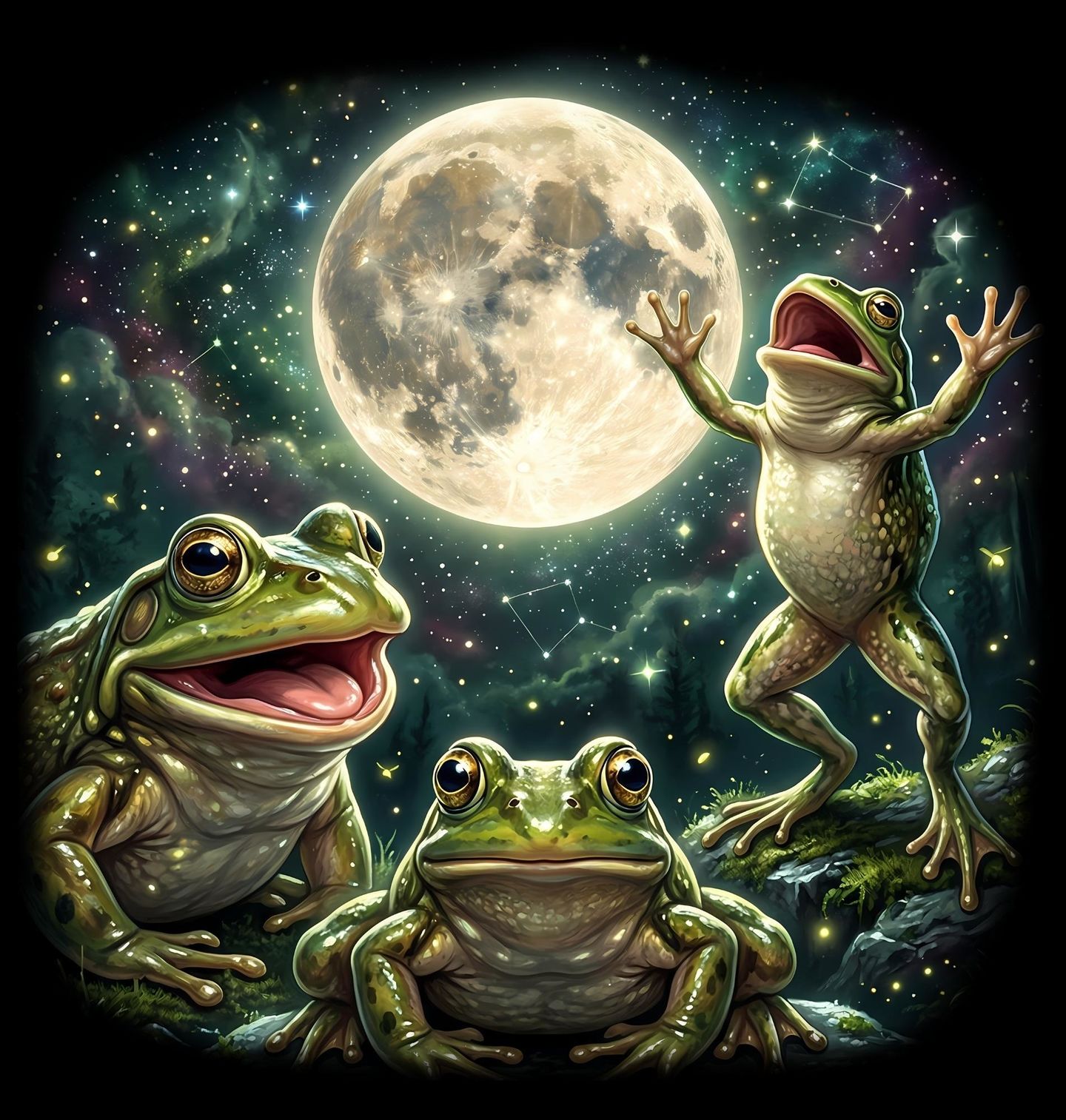 Pánské tričko Žáby pod Měsícem. Detailně zpracovaná ilustrace zachycuje tři žáby v noční krajině pod zářícím úplňkem. Jedna z nich stojí na kameni s roztaženými končetinami, jako by zpívala nebo oslavovala noční atmosféru, zatímco ostatní ji sledují. Na pozadí je hvězdná obloha s náznaky souhvězdí, což dodává scéně téměř magický nádech