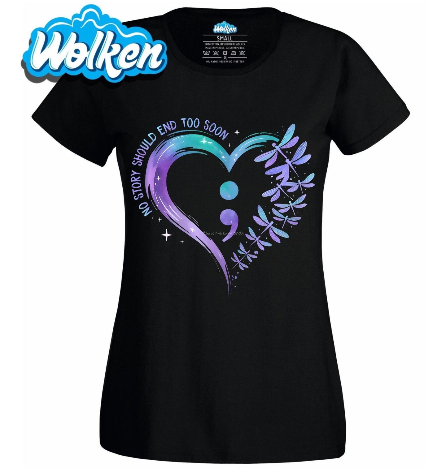 Dámské tričko Žádný příběh by neměl skončit příliš brzy. Spojení srdce, vážek a středníku (;), který se stal celosvětovým symbolem prevence sebevražd a podpory duševního zdraví. Nápis „No story should end too soon“ znamená „Žádný příběh by neměl skončit příliš brzy“ a připomíná, že každý život má cenu.