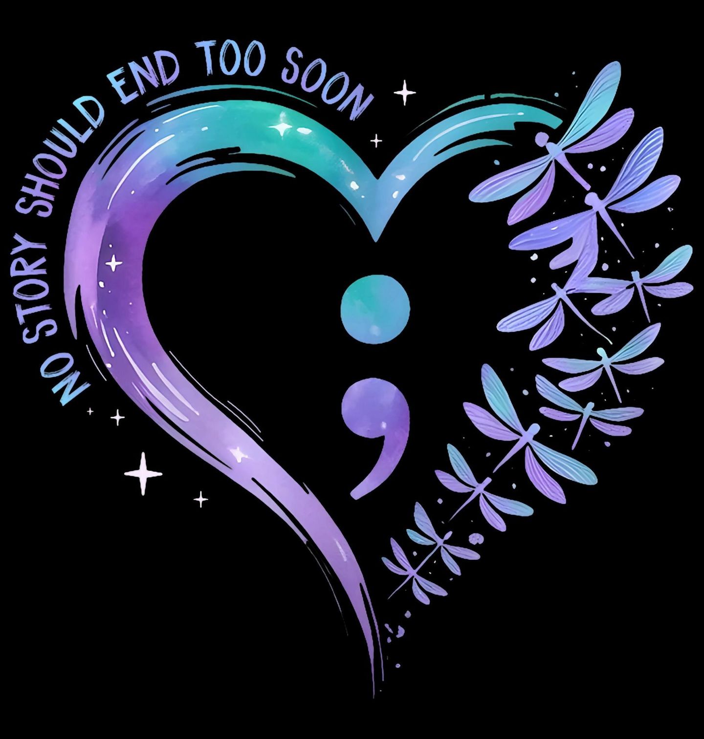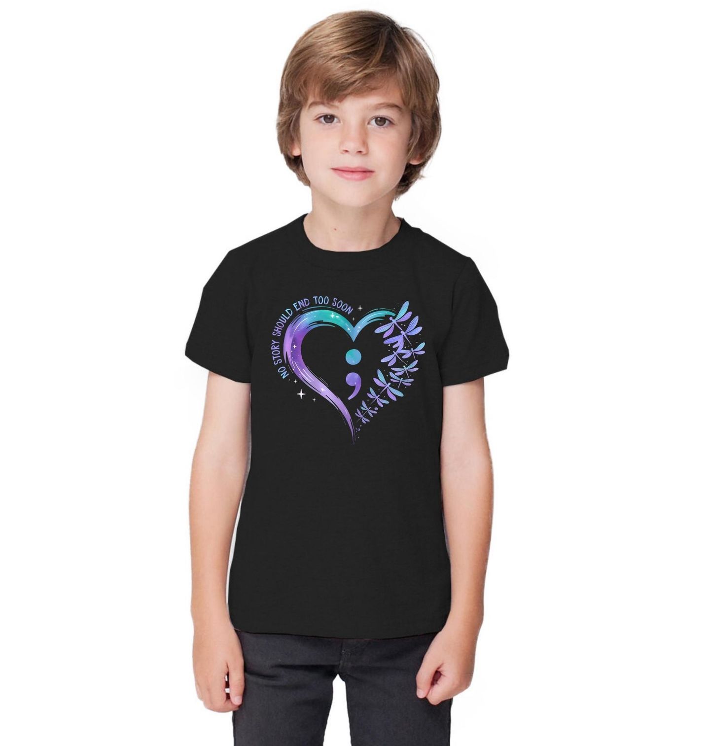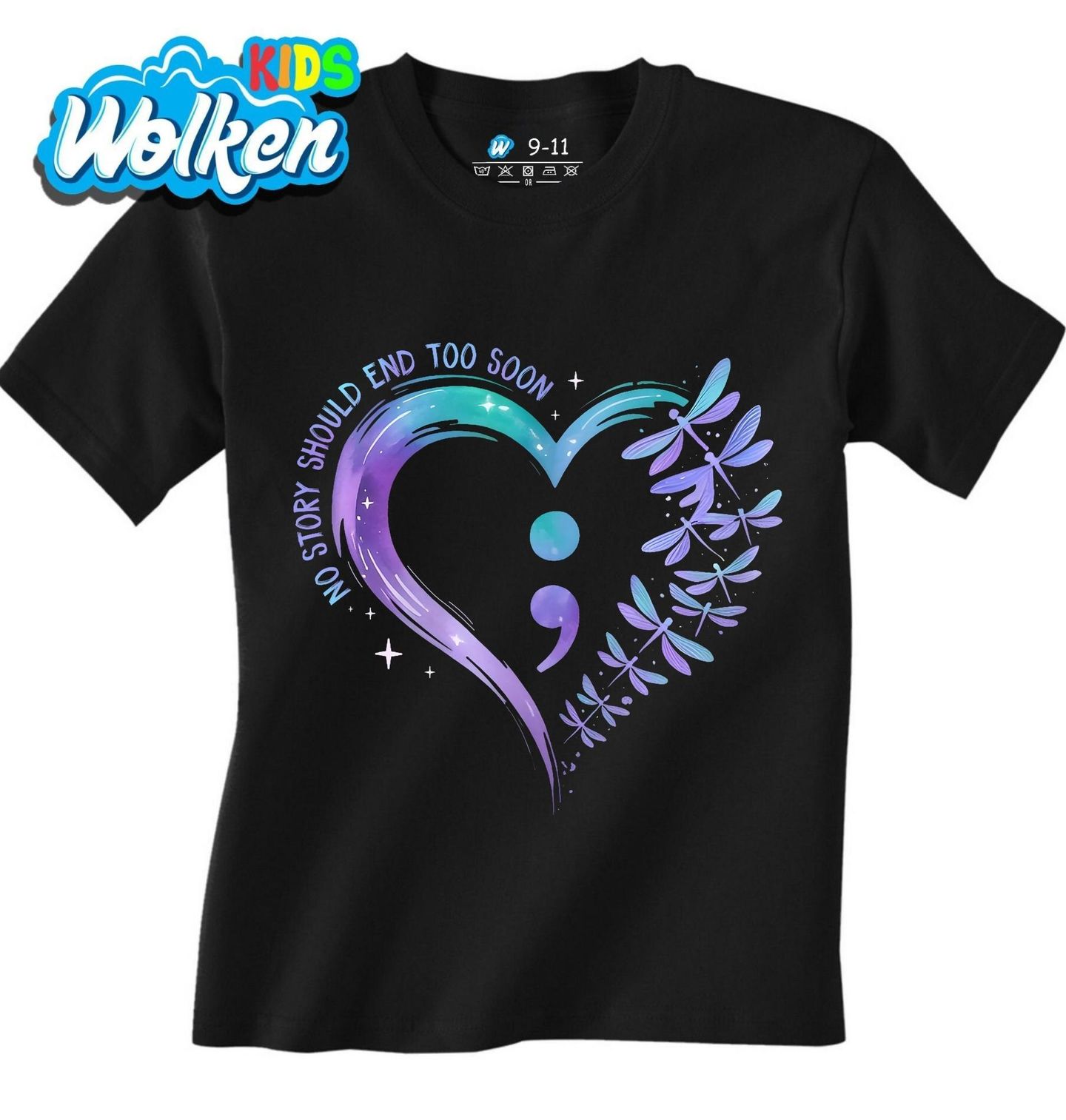 Dětské tričko Žádný příběh by neměl skončit příliš brzy. Spojení srdce, vážek a středníku (;), který se stal celosvětovým symbolem prevence sebevražd a podpory duševního zdraví. Nápis „No story should end too soon“ znamená „Žádný příběh by neměl skončit příliš brzy“ a připomíná, že každý život má cenu.