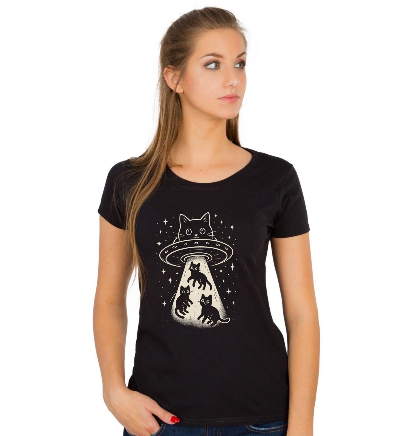 Dámské tričko Záhadné Kočičí UFO. Originální a roztomilý motiv, kde kočka pilotuje ufo a v paprsku světla unáší další tři kočky do nekonečného vesmíru. Nadšení mimozemšťané by klidně mohli být právě kočky, protože kdo jiný by vládl hvězdám? Tento design je ideální pro všechny milovníky koček, humoru a vesmírných dobrodružství.