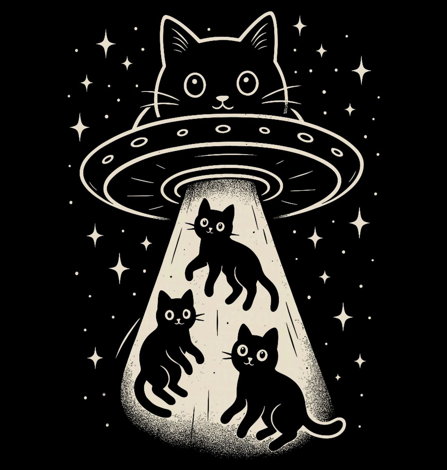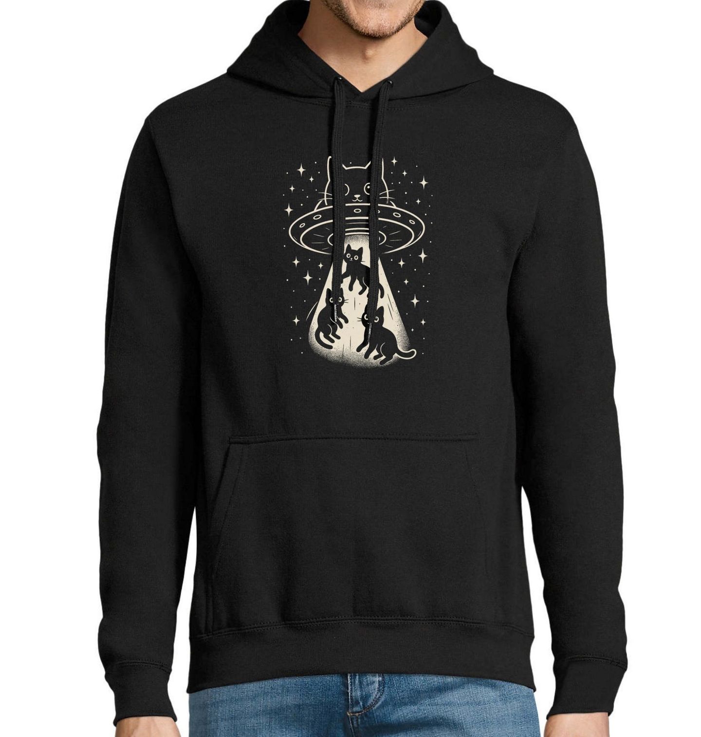 Pánská mikina Záhadné Kočičí UFO. Originální a roztomilý motiv, kde kočka pilotuje ufo a v paprsku světla unáší další tři kočky do nekonečného vesmíru. Nadšení mimozemšťané by klidně mohli být právě kočky, protože kdo jiný by vládl hvězdám? Tento design je ideální pro všechny milovníky koček, humoru a vesmírných dobrodružství.