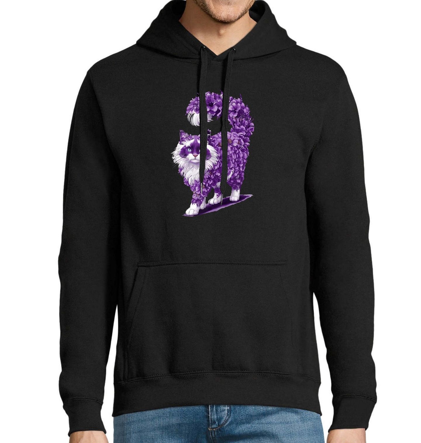 Pánská mikina Zahradní Kočka z Fialových Květin. Toto originální tričko s motivem fialové kočky složené z jemných květin okouzlí každého milovníka zvířat i přírody. Kočka na potisku působí elegantně a magicky, její srst je vytvořena z detailně propracovaných okvětních lístků fialek a macešek. Ideální pro ty, kdo chtějí v outfitu spojit krásu kočky a půvab květin.