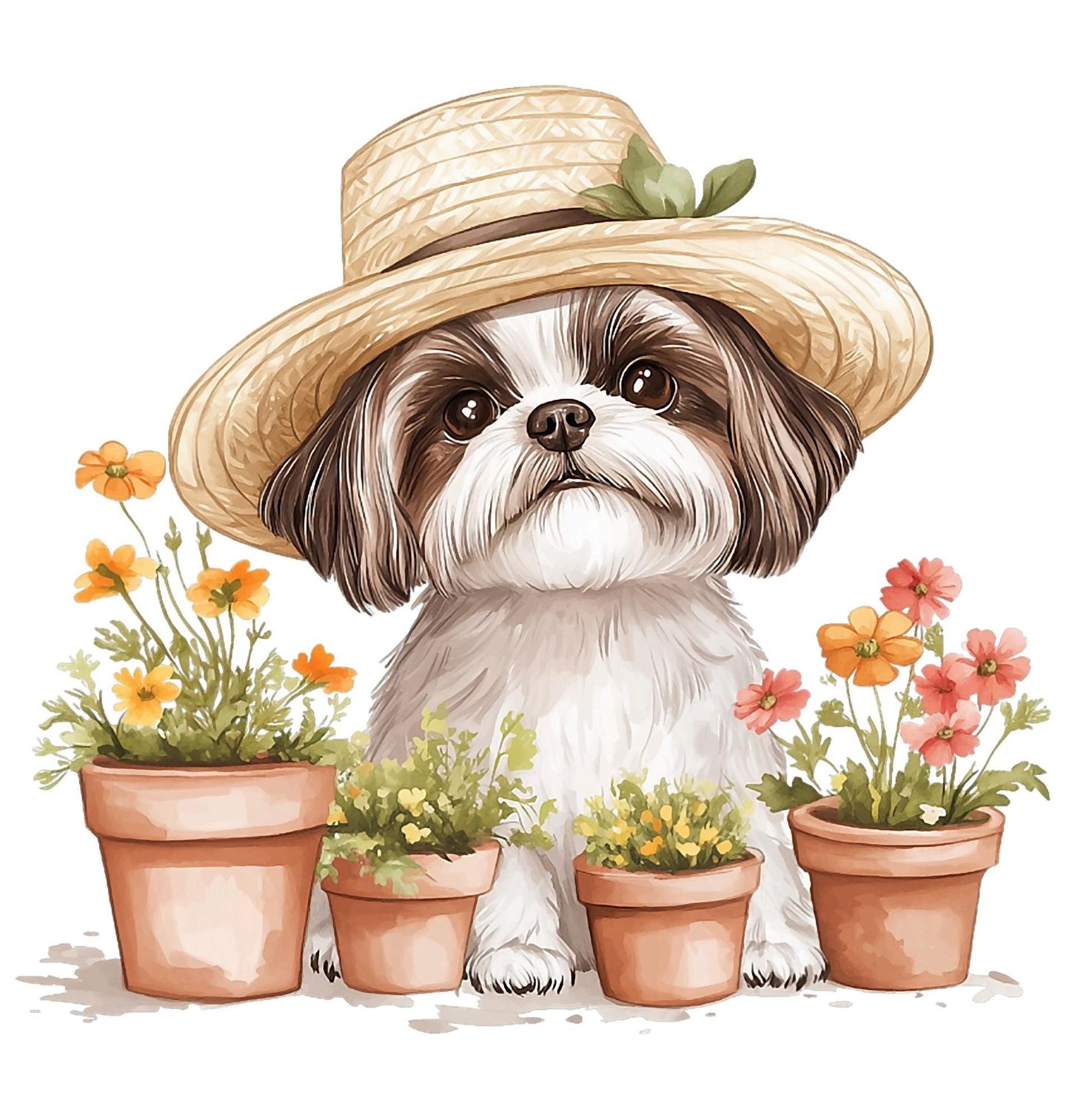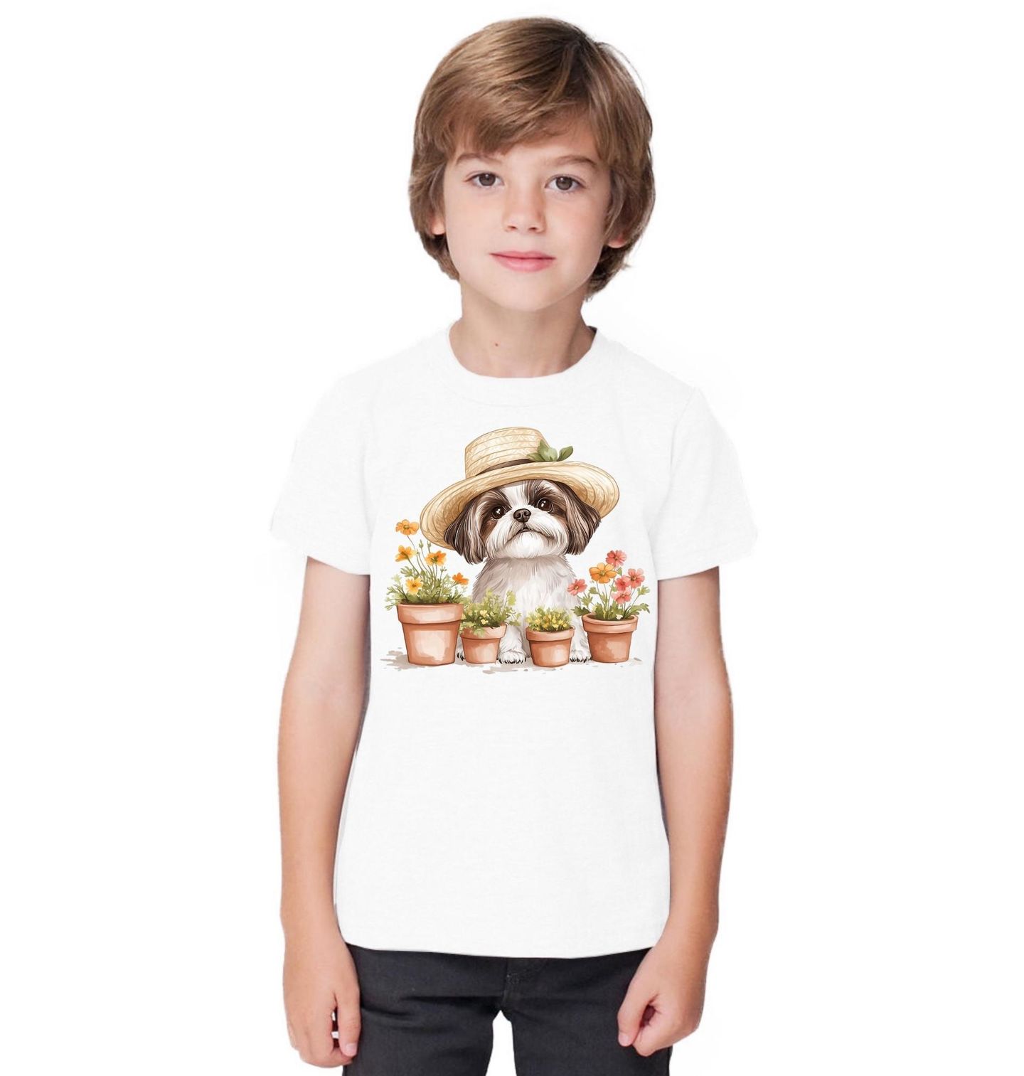 Dětské tričko Zahradní Shih-Tzu v Klobouku. Roztomilý akvarelový motiv s Shih Tzu psem v slaměném klobouku obklopeným květináči a jarními květinami. Ideální dárek pro milovníky psů, Shih Tzu, zahradničení a jemného cottagecore stylu. Pro každého pejskaře, pro kterého je pes jeho nejlepším přítelem.