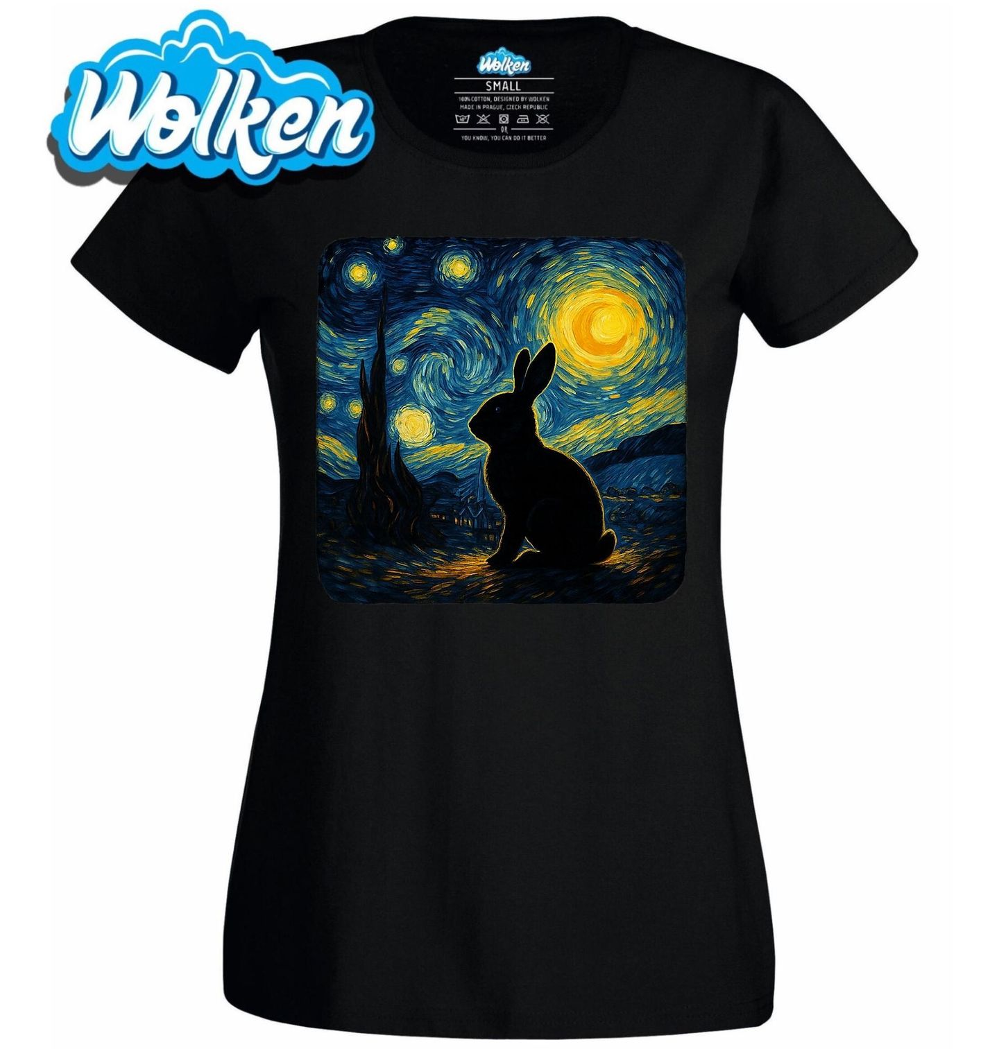 Dámské tričko Zajíc ve Hvězdné noci. Na temném pozadí se vyjímá králík sedící pod vířící oblohou, inspirovanou slavným obrazem Hvězdná noc od Vincenta van Gogha. Tento design přináší králík a hvězdná noc do jednoho snového celku, který okouzlí milovníky zvířat i umění.