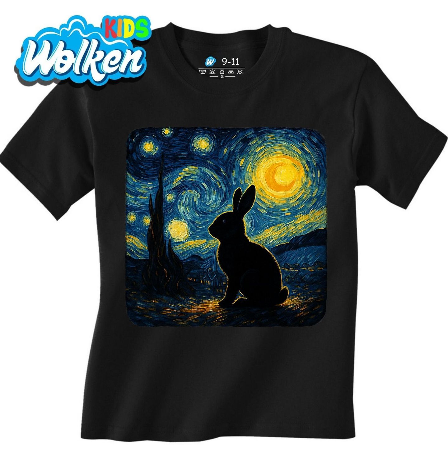 Dětské tričko Zajíc ve Hvězdné noci. Na temném pozadí se vyjímá králík sedící pod vířící oblohou, inspirovanou slavným obrazem Hvězdná noc od Vincenta van Gogha. Tento design přináší králík a hvězdná noc do jednoho snového celku, který okouzlí milovníky zvířat i umění.