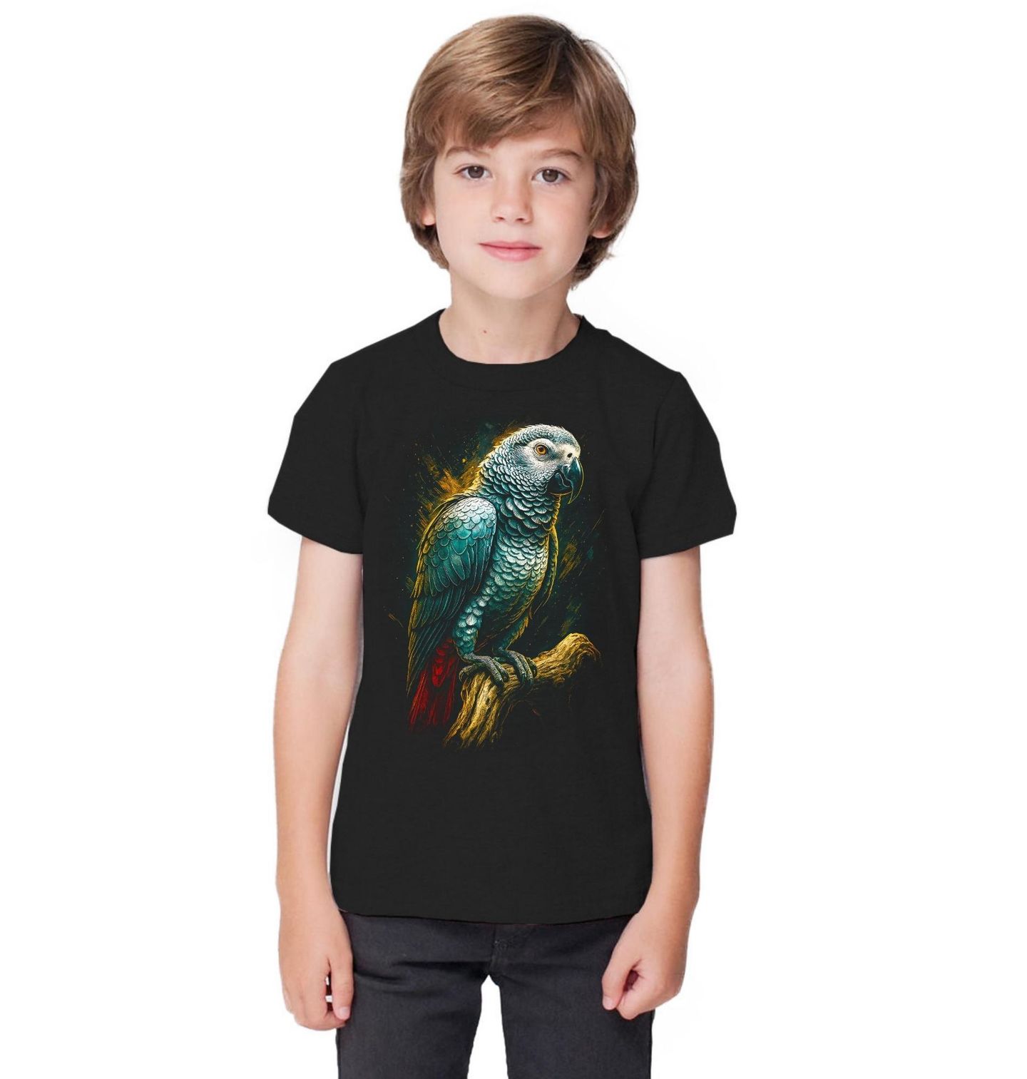 Dětské tričko Žako šedý. Papoušek žako šedý, výjimečný exotický pták známý svou inteligencí, klidem a silnou osobností. Jemně strukturované šedé peří s typickým červeným ocasem vytváří kontrast, který působí elegantně a nadčasově. Žako šedý patří mezi nejchytřejší druhy papoušků na světě. Tento papoušek je schopen napodobovat lidskou řeč i rozpoznávat emoce.