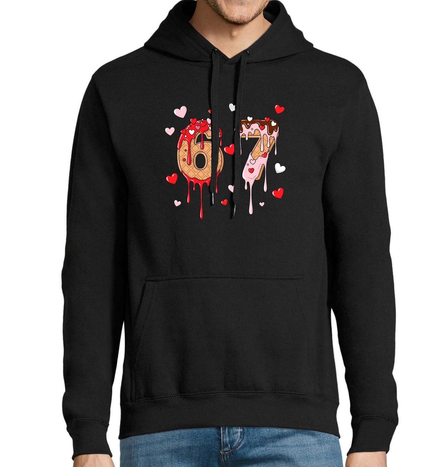 Pánská mikina Zamilovaná 67 Six Seven Meme. Na motivu je číslo 67, které je vytvořené jako sladká oplatka polité různými polevami. Z čísla stéká barevná čokoláda a kolem jsou rozesetá malovaná srdce. Celý design působí hravě a vtipně jako moderní meme a odkazuje také na výraz six seven. Sladká a zamilovaná kombinace pro všechny fanoušky čísla 67.
