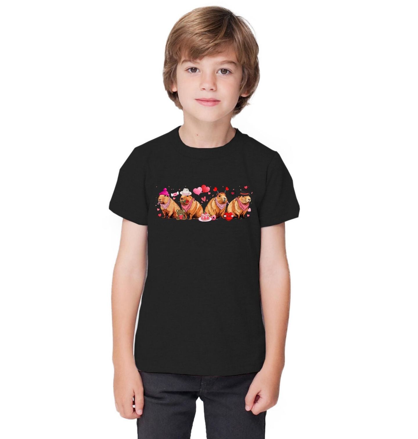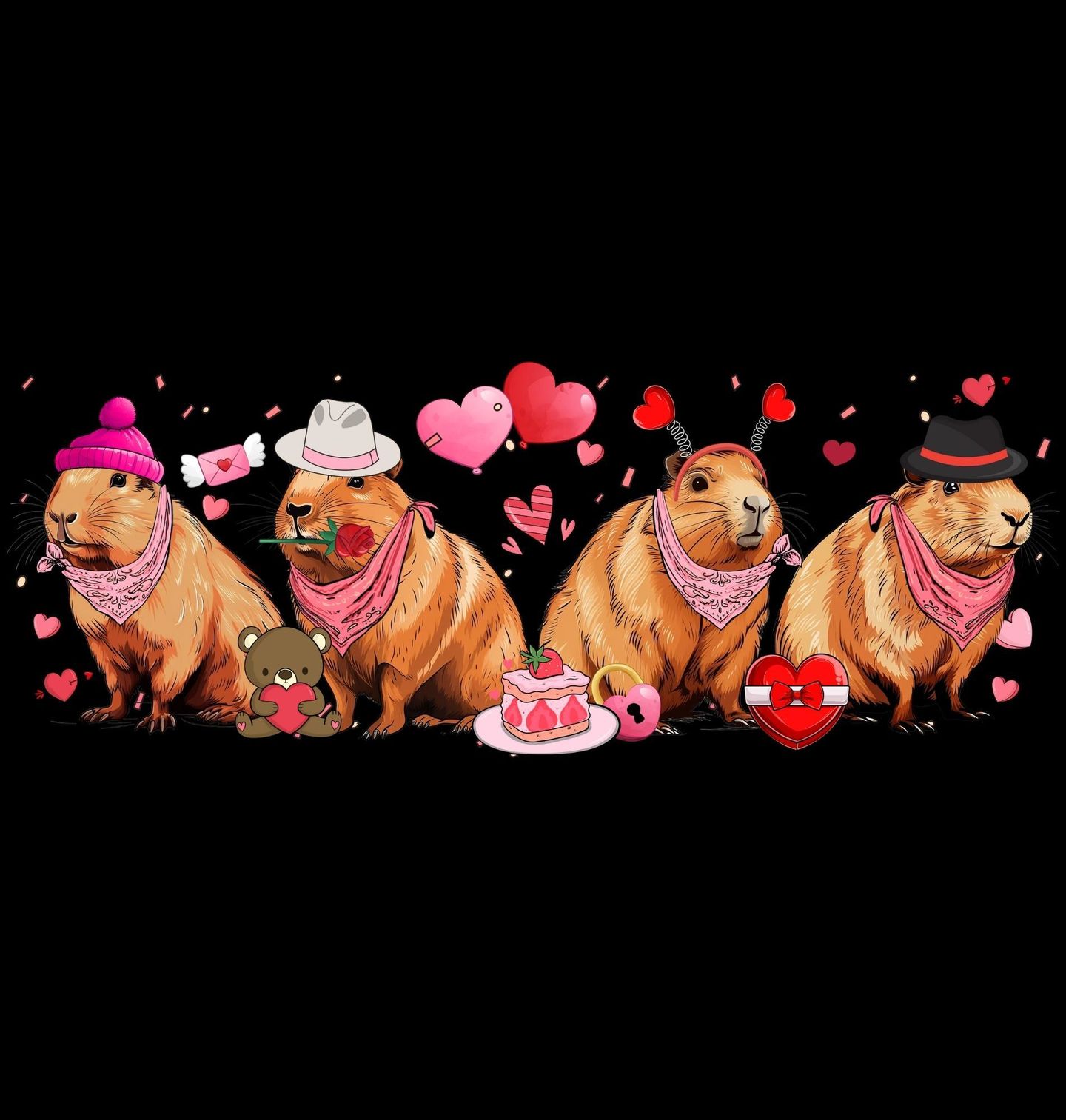 Dětské tričko Zamilované Kapybary. Čtyři zamilované kapybary v čepičkách, kloboucích a růžových šátcích, obklopené srdíčky, dortíky a dárky – to je motiv, který roztaje každé srdce. Ať už hledáš originální dárek na Valentýna, nebo si chceš udělat radost, tento design ti připomene, že kapybara je ten nejmilejší hlodavec na světě!