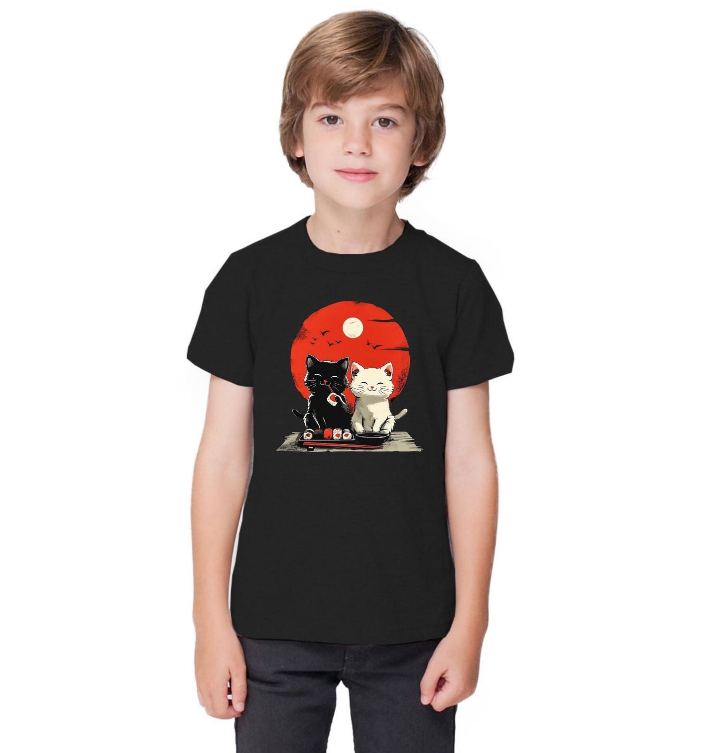 Dětské tričko Zamilované Kočky na Sushi Rande. Na motivu sedí dvě roztomilé kočky vedle sebe a společně si užívají talíř lahodného sushi. Černá kočka drží kousek sushi v tlapkách a bílá působí spokojeně a zamilovaně. V pozadí je velké červené slunce a siluety ptáků, což připomíná tradiční Japonsko.