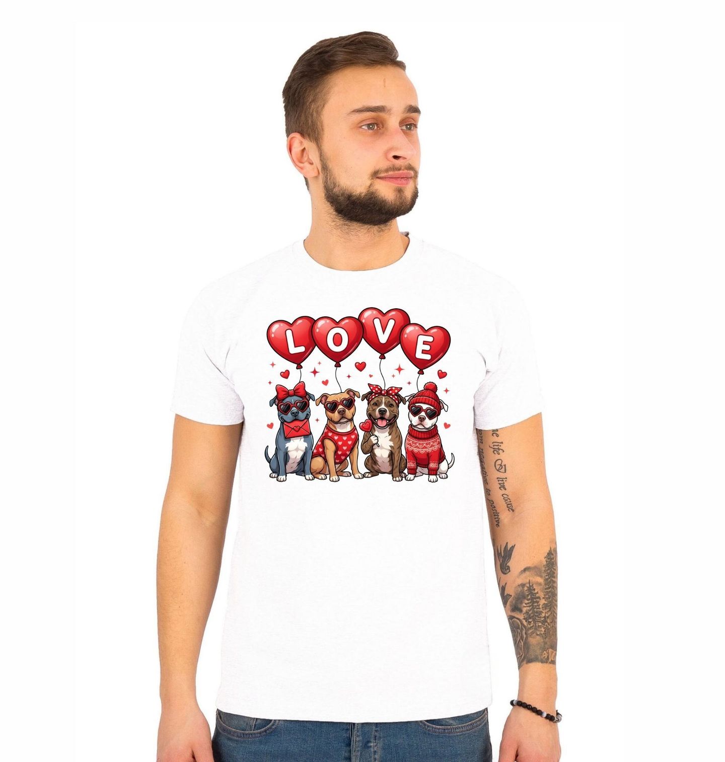 Pánské tričko Zamilovaní Američtí Stafordšírští Teriéři LOVE. Na obrázku jsou stylizovaní zástupci tzv. bull plemen – především americký stafordšírský teriér (Amstaff), pitbull (American Pit Bull Terrier) a podobné typy. Tyto psy jsou známé svou silou, věrností a přátelskou povahou k lidem. Čtyři výrazní pes v romantickém designu se srdíčky a balónky tvoří nápis LOVE a ukazují, že pravý pejskař ví, co znamená skutečná láska ke čtyřnohým parťákům.