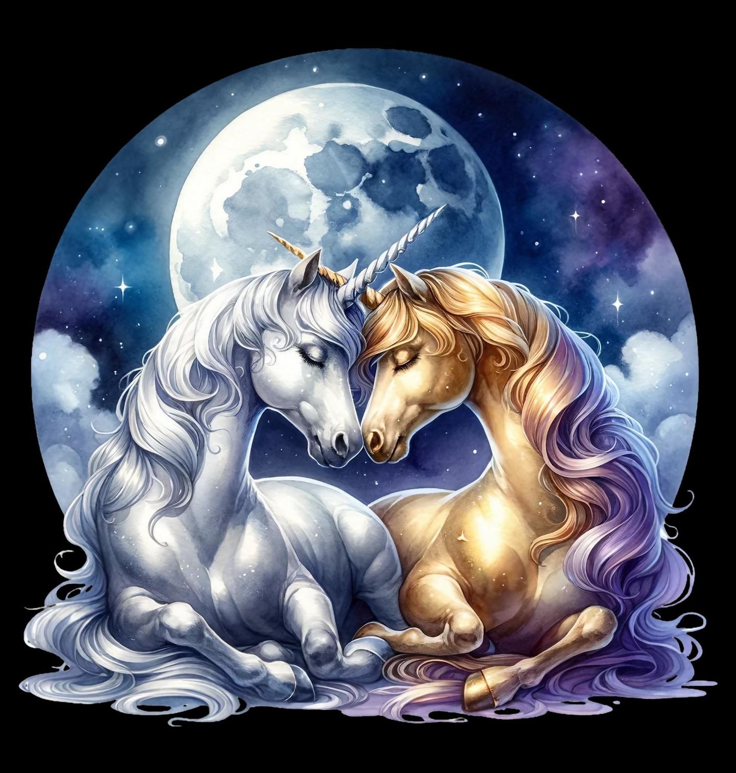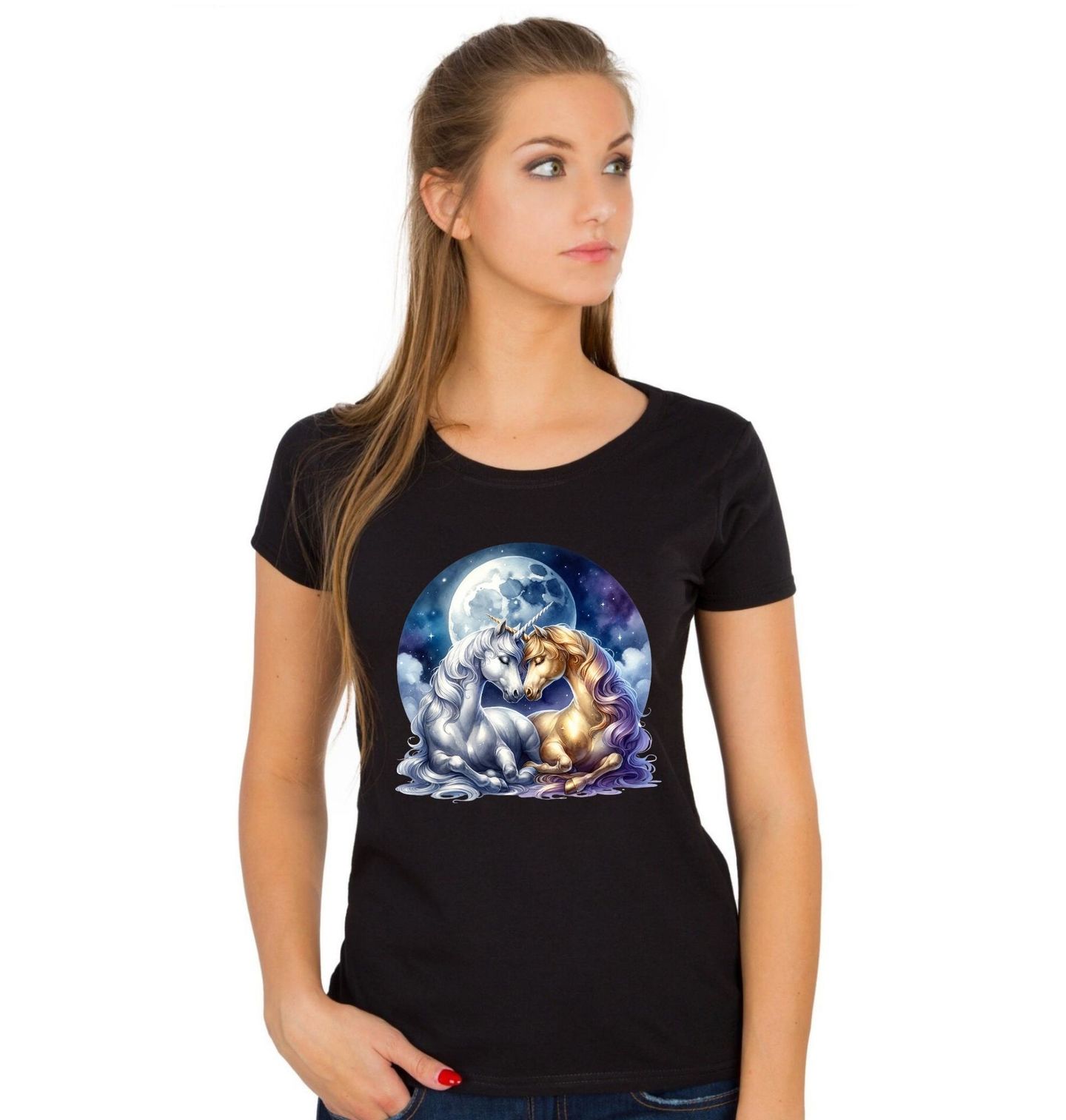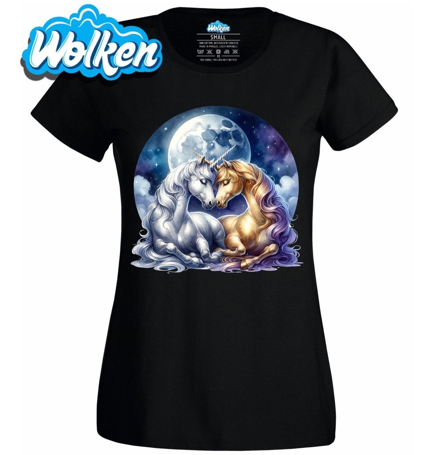 Dámské tričko Zamilovaní Jednorožci. Něžný a kouzelný motiv, kde se dva jednorožci láskyplně objímají pod zářícím měsícem na noční obloze. Tato ilustrace propojuje pohádkovou fantazii s romantikou vesmíru a je ideální pro každého, kdo miluje mystická stvoření a snové výjevy.
