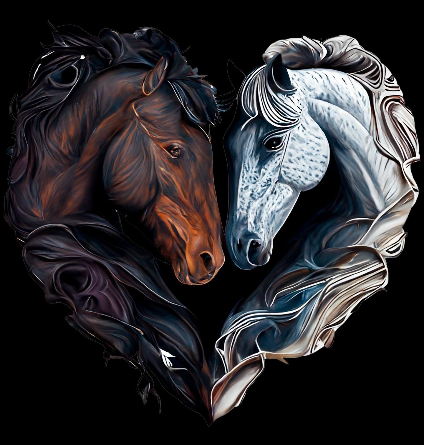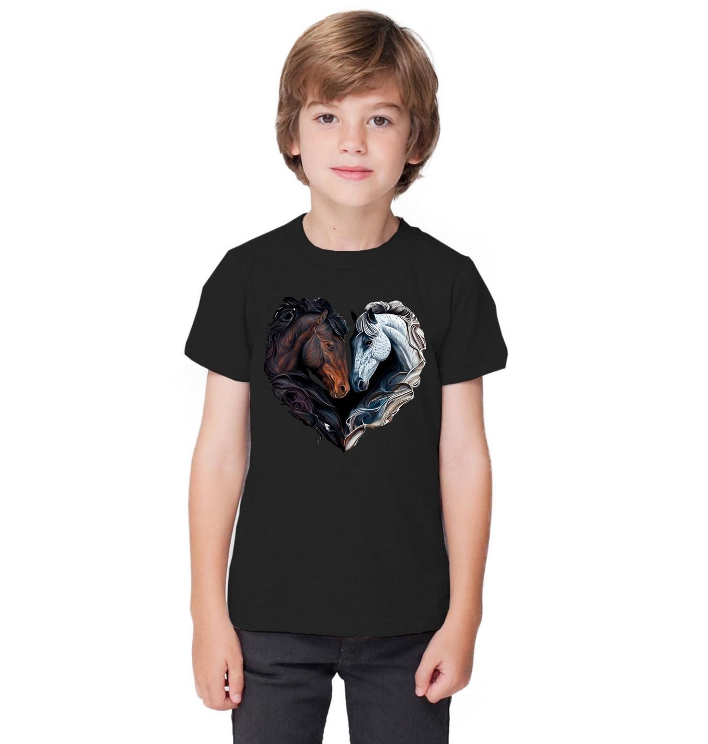 Dětské tričko Zamilovaní Koně. Tento jedinečný motiv zachycuje dva elegantní koně, jejichž hřívy se jemně proplétají do tvaru srdce. Dokonalé spojení síly, svobody a něžnosti potěší každého, komu je kůň blízký. Motiv srdce symbolizuje lásku ke zvířatům i hluboké pouto mezi člověkem a koněm. Ideální pro milovníky přírody, jezdectví a romantických motivů.