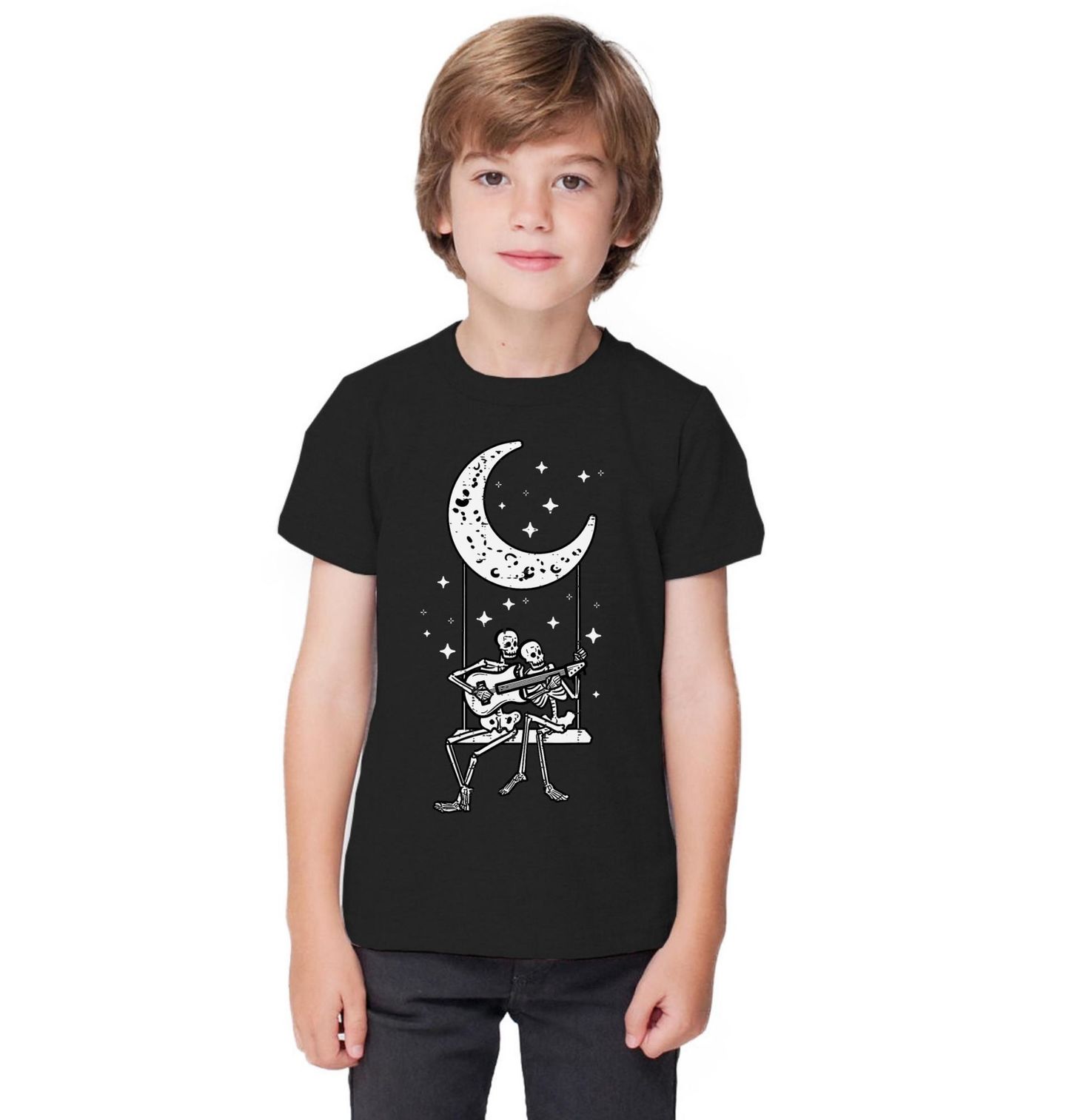 Dětské tričko Zamilovaní Kostlivci na Měsíční Houpačce. Tajemná noční atmosféra, hvězdná obloha a výrazný měsíc v úplňkovém tichu. Na houpačce zavěšené pod srpkem měsíce sedí zamilovaný pár – každý kostlivec drží elektrickou kytaru a společně tvoří dokonalou harmonii. Tento motiv spojuje romantiku noci s energií, kterou přináší rock and roll.