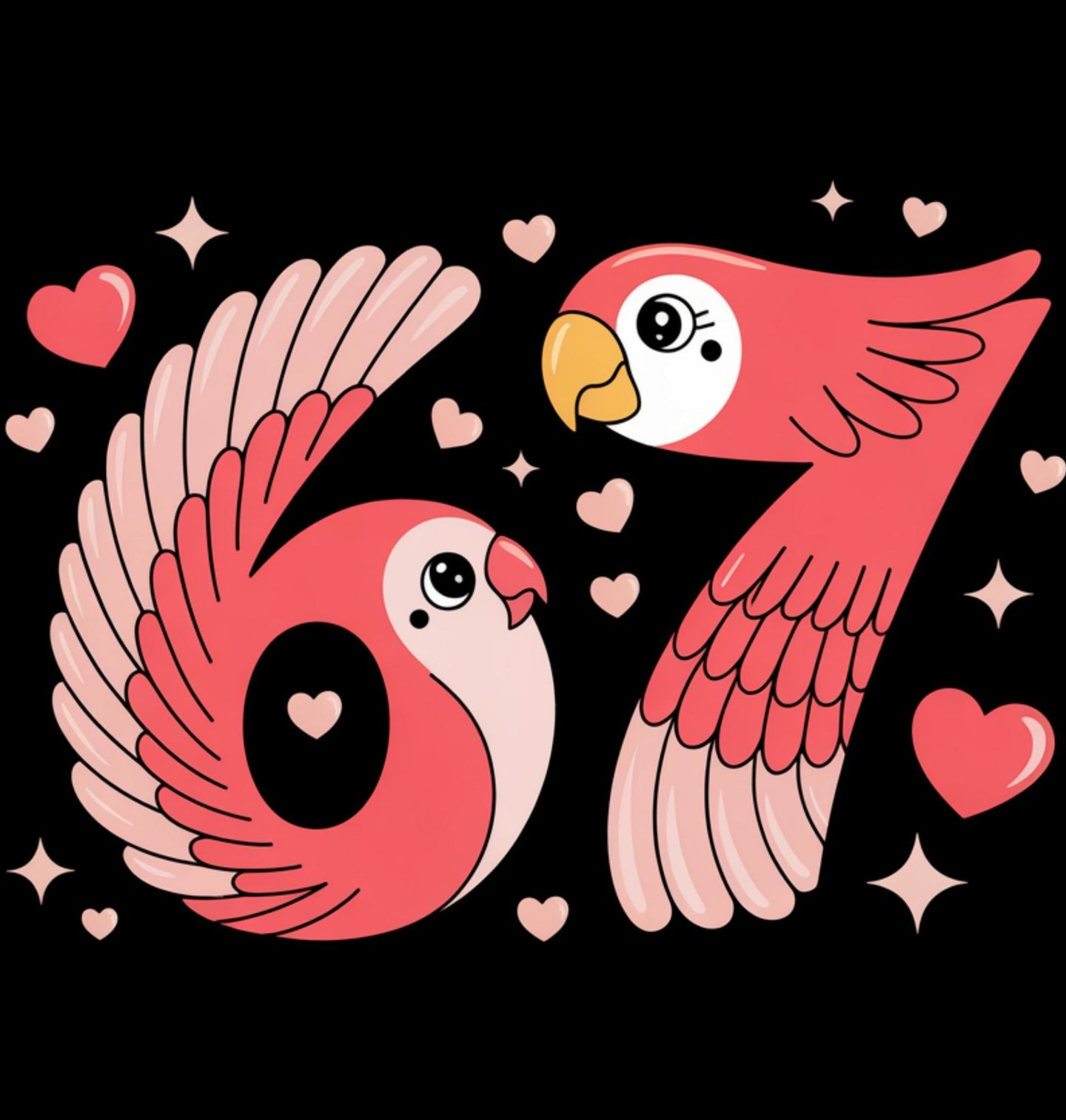 Dámské tričko Zamilovaní Papoušci 67 Six Seven. Šestka je složená z kulatého ptáčka s roztaženými křídly a sedmička má podobu druhého ptáčka v letu. Kolem poletují srdíčka a hvězdičky, takže celý motiv působí hravě a roztomile jako moderní meme. Design zároveň odkazuje na pojem six seven a samozřejmě výrazné číslo 67.