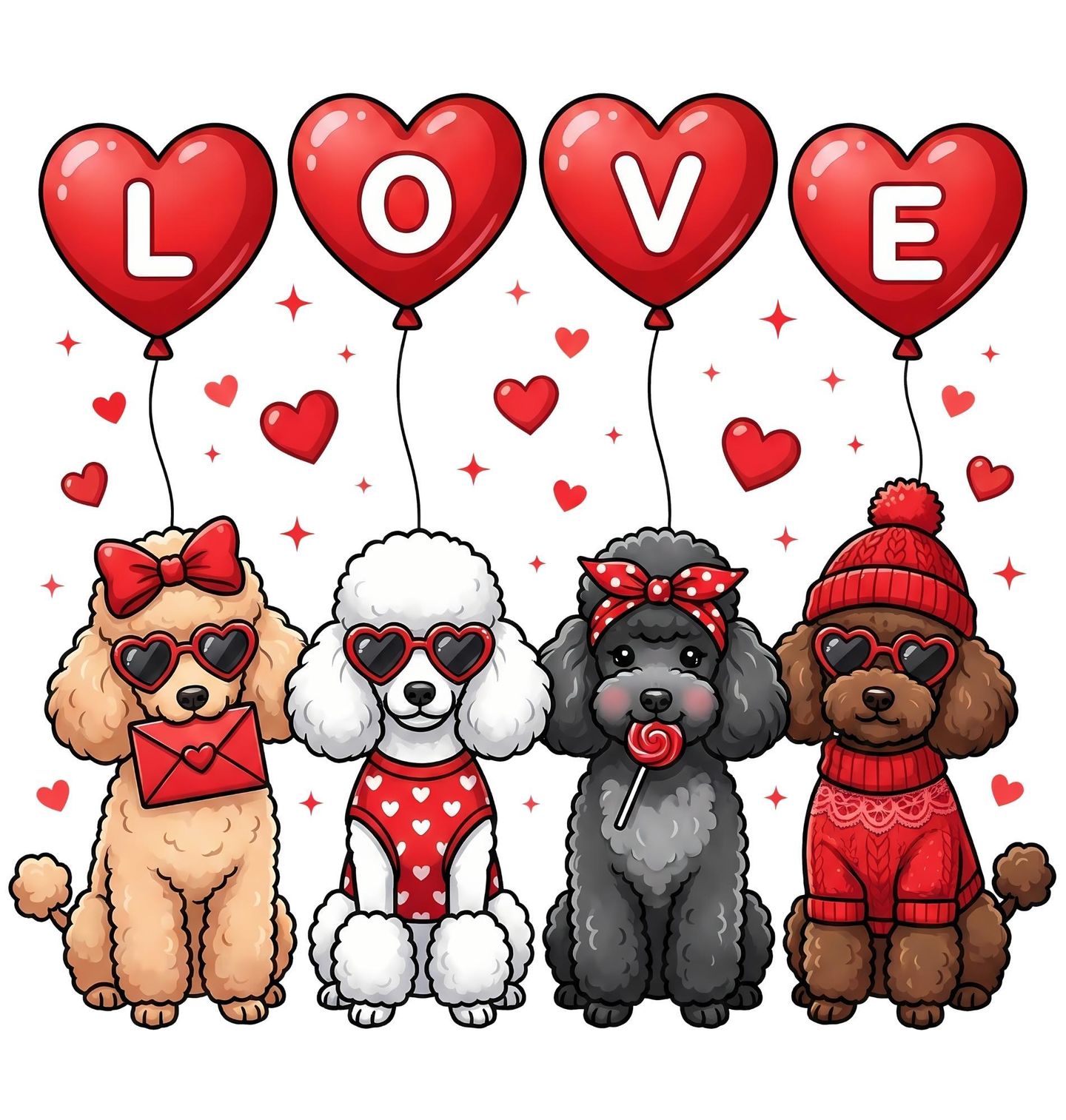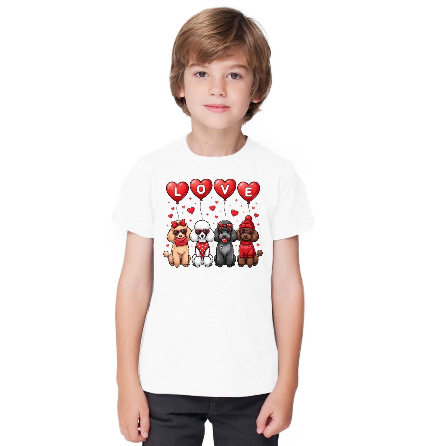 Dětské tričko Zamilovaní Pudlové LOVE. Roztomilý a stylový motiv, který oslavuje jedinečné kouzlo plemene pudl. Čtyři elegantní pes v podobě pudlů tvoří nápis LOVE a ukazují, proč je toto plemeno tak oblíbené mezi každým pejskař. Stylové doplňky, srdíčka a hravý design dodávají motivu romantickou a veselou atmosféru. Pudl je známý svou inteligencí, elegancí a přátelskou povahou – a přesně to tento motiv vystihuje.