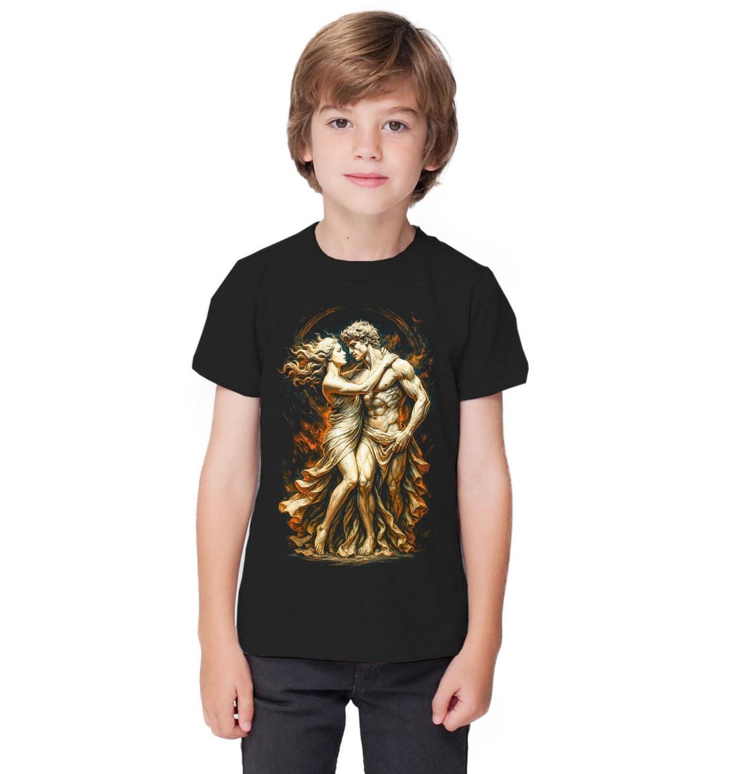 Dětské tričko Zamilovaný Eros a Psyché. Řecká mytologie vypráví jejich příběh jako symbol lásky, která překonává zkoušky, strach i zásahy bohů. Psyché, zosobnění lidské duše, a Eros, bůh lásky, představují spojení těla a ducha, vášně a něhy. Jejich příběh patří mezi nejdojemnější milostné legendy, které řecká mytologie předala dalším generacím.